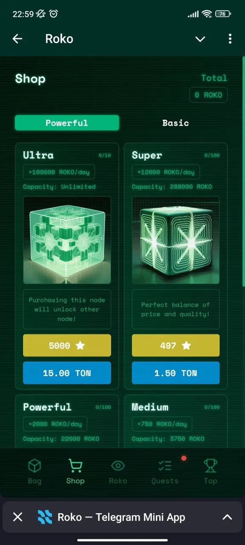 - Ноды: инвестиции в ноды (за ROKO, Telegram Stars или TON) увеличивают пассивный доход — для получения вознаграждений требуется регулярный сбор.