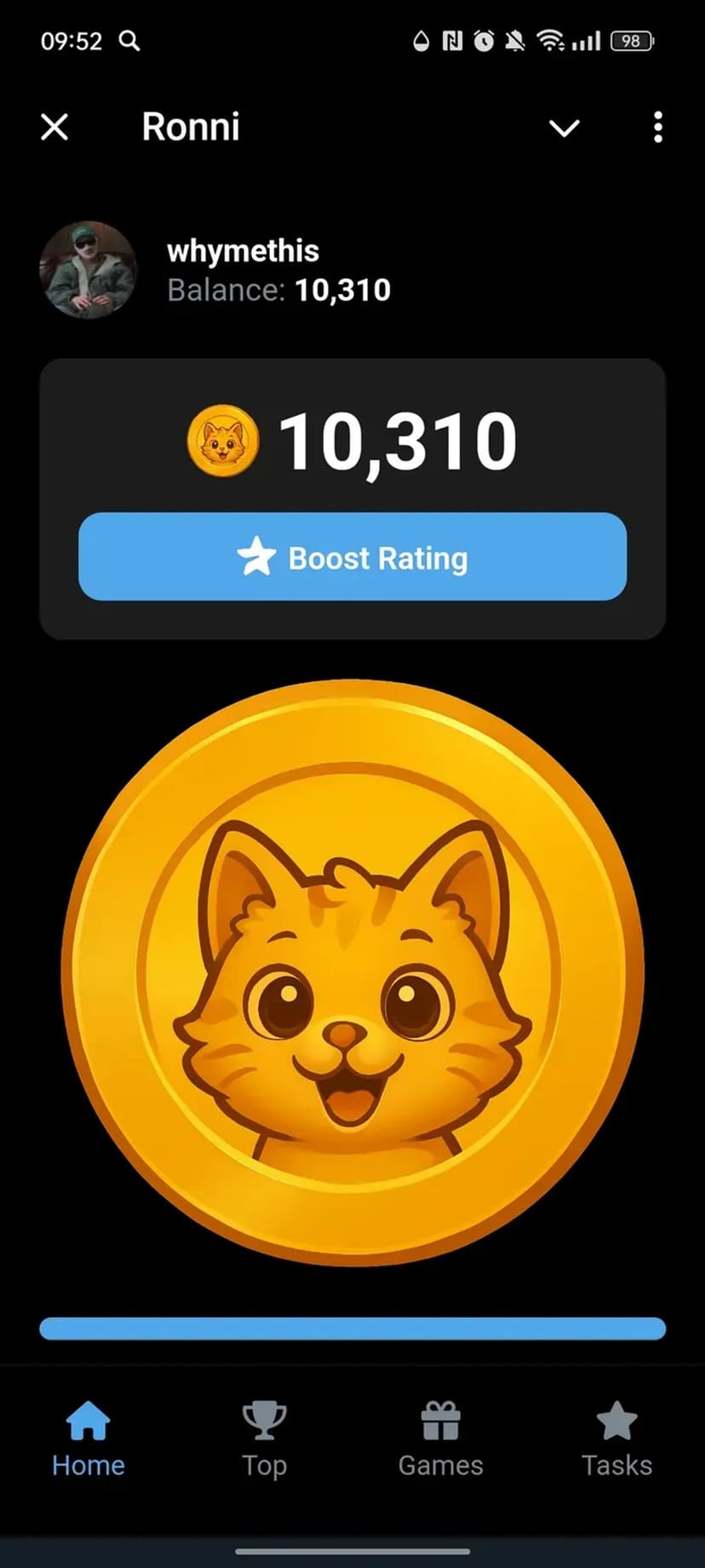 За успешное выполнение заданий начисляются $RONNI, которые аккумулируются в личном кабинете. Интерфейс оформлен как интуитивное мини-приложение с быстрым откликом и возможностью отслеживать прогресс по заданиям.