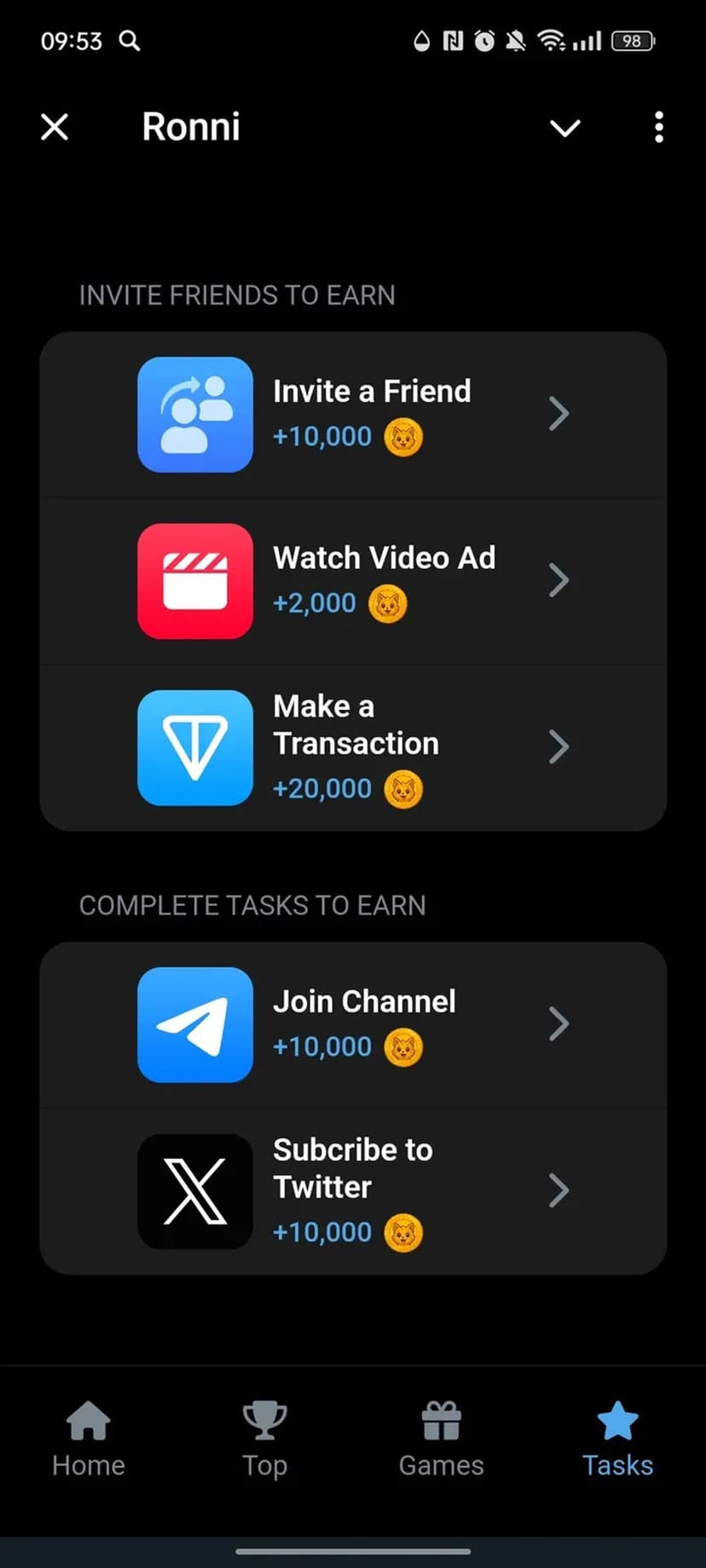Зарабатывайте токены $RONNI за простые задания: подписки, просмотры, приглашения