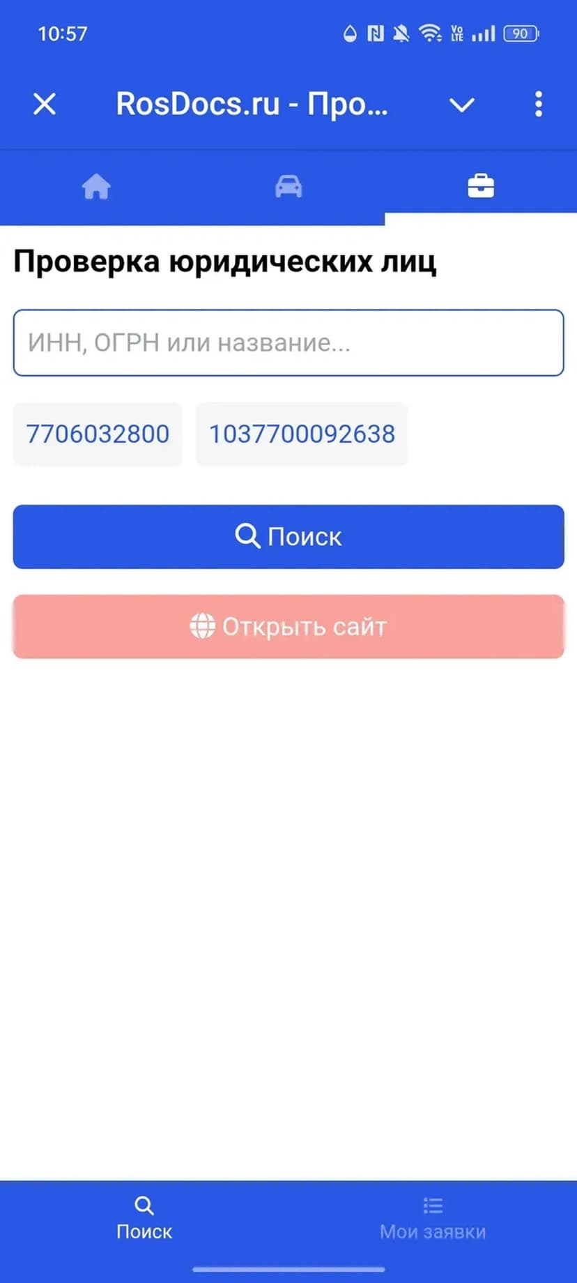 - Юридические лица и ИП: поиск по ИНН или ОГРН с информацией о компании и её статусе.