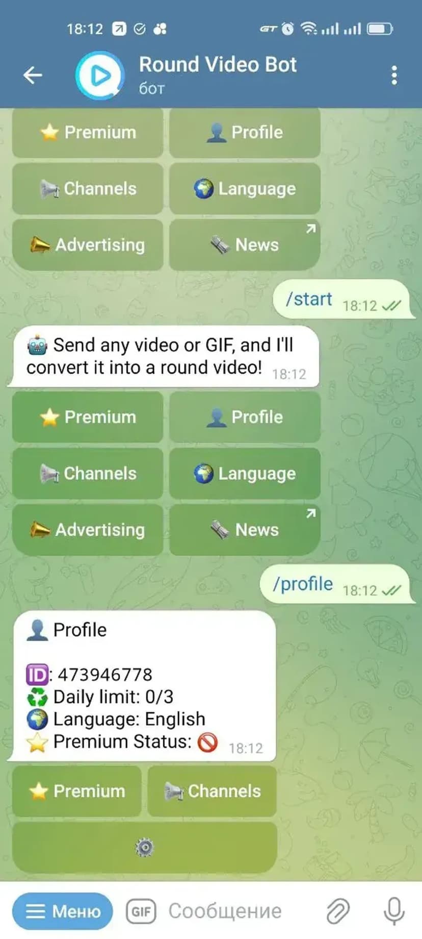- Автоматическая конвертация: отправьте видео или GIF в чат, бот вернёт готовый круглый файл.