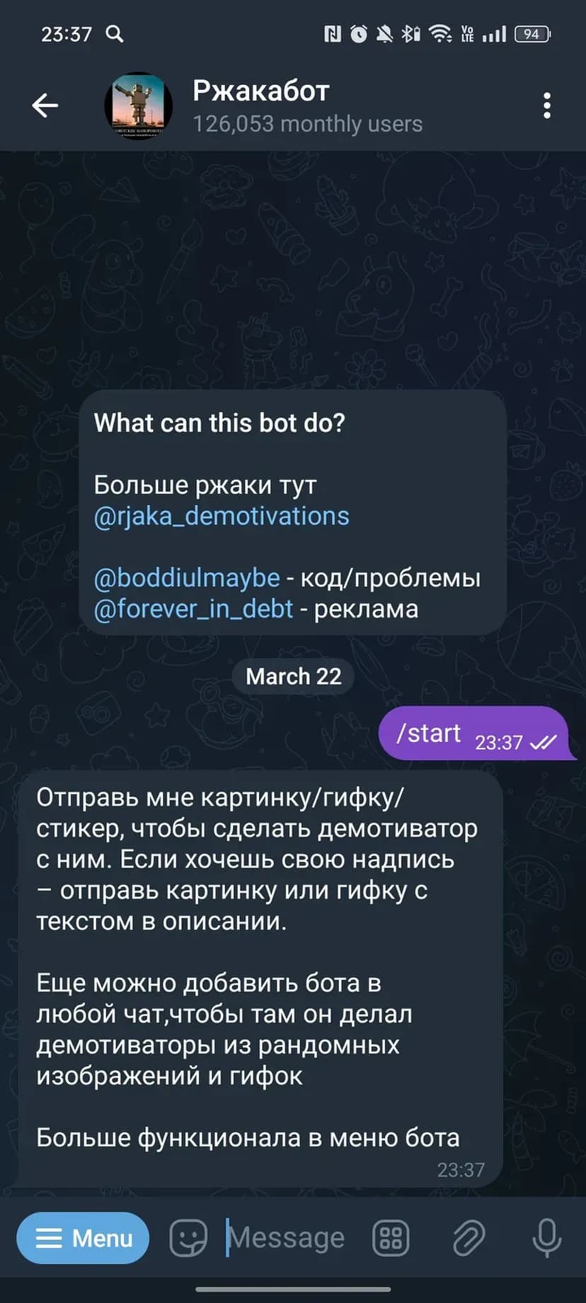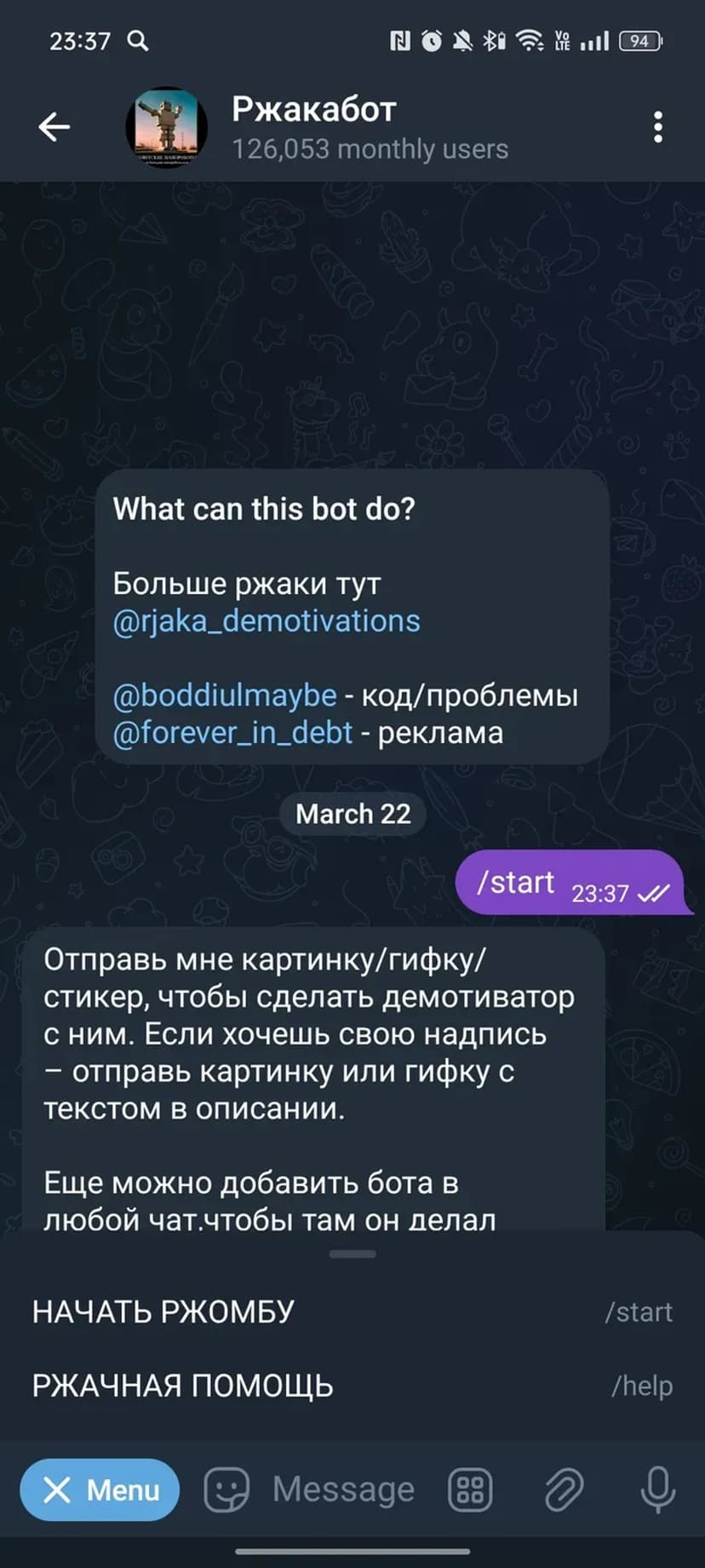 Ржакабот автоматически создаёт демотиваторы из изображений и GIF, генерируя юмористические картинки прямо в чате без перехода на сторонние сервисы.