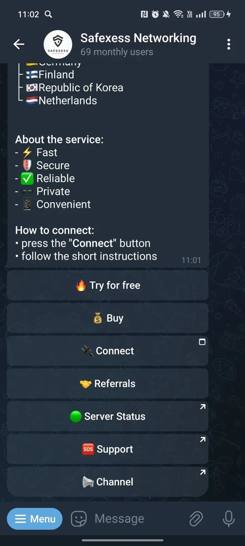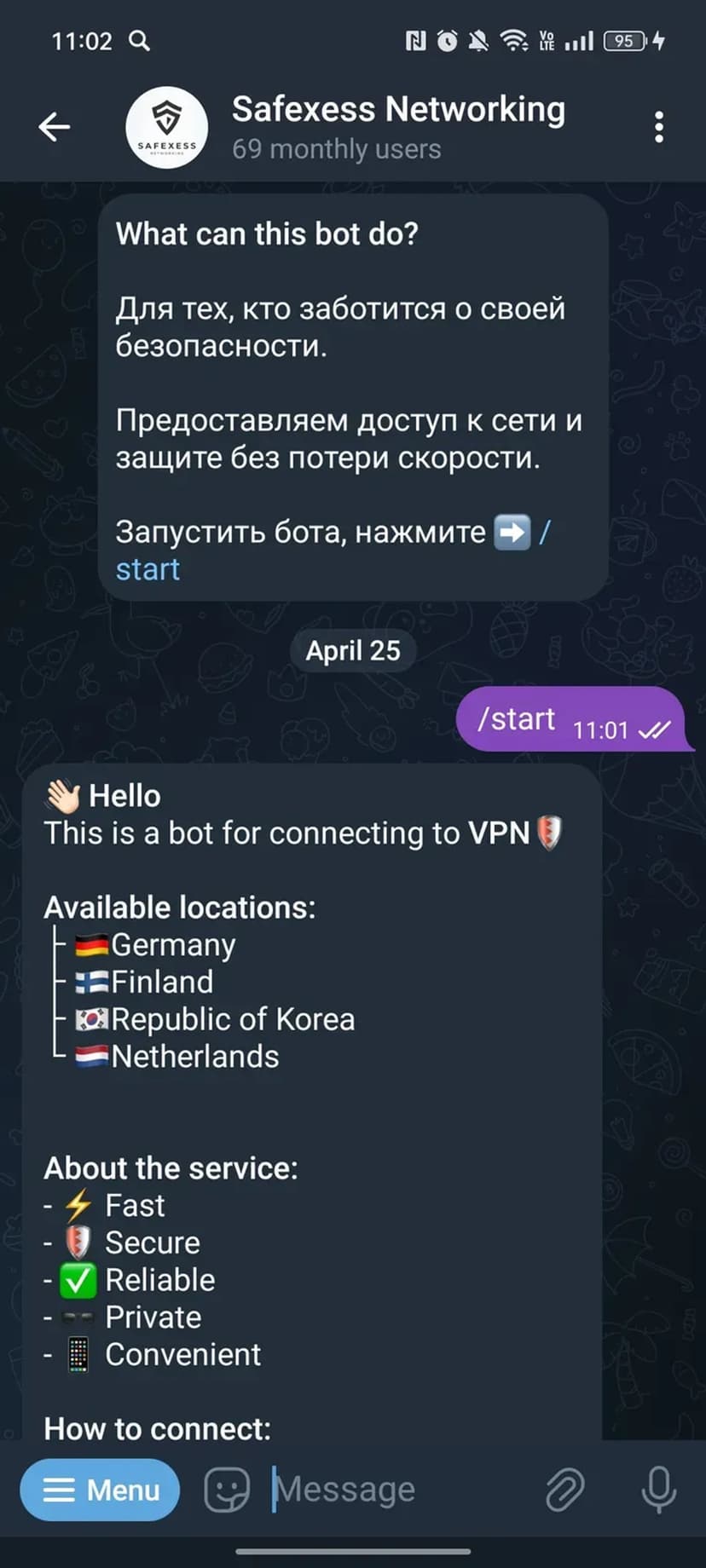 *Нажимая "Открыть в Telegram", вы перейдете к приложению Safexess VPN Bot 🛡 в мессенджере Telegram