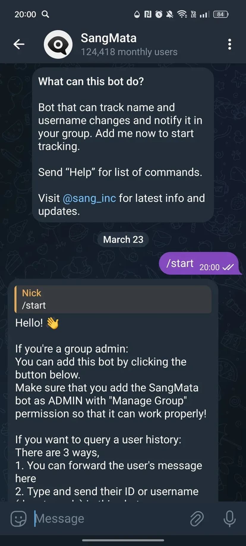 SangMata отслеживает изменения отображаемых имён и юзернеймов участников групповых чатов и уведомляет сообщество о таких событиях в режиме реального времени.