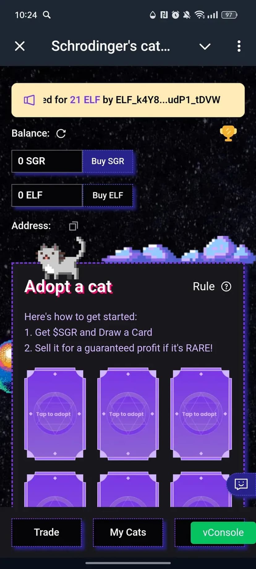 Каждый кот обладает уникальными характеристиками и уровнем редкости. Игроки могут обмениваться между собой, пополнять коллекцию или искать редкие экземпляры. За активность и выполнение заданий начисляются Flux Points, которые затем можно конвертировать в токены $SGR.