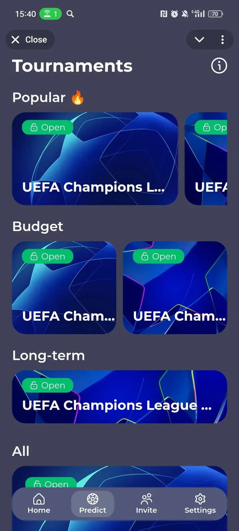 - Выбор актуального матча из списка и ввод прогноза на точный счёт.