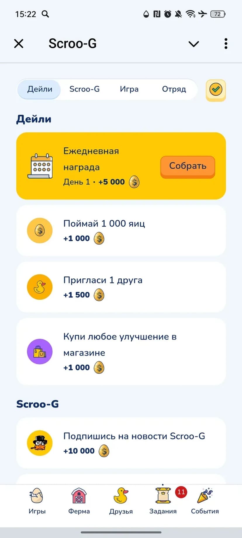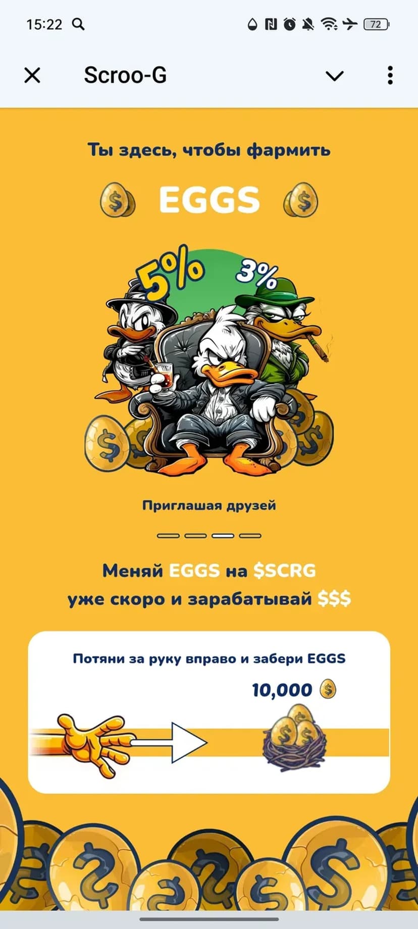 Scroo-G [beta] сочетает механики фермы, кликера и экономической игры: игроки развивают виртуальную ферму, добывают игровой ресурс EGGS и конвертируют его в токены $SCRG и другие цифровые активы.