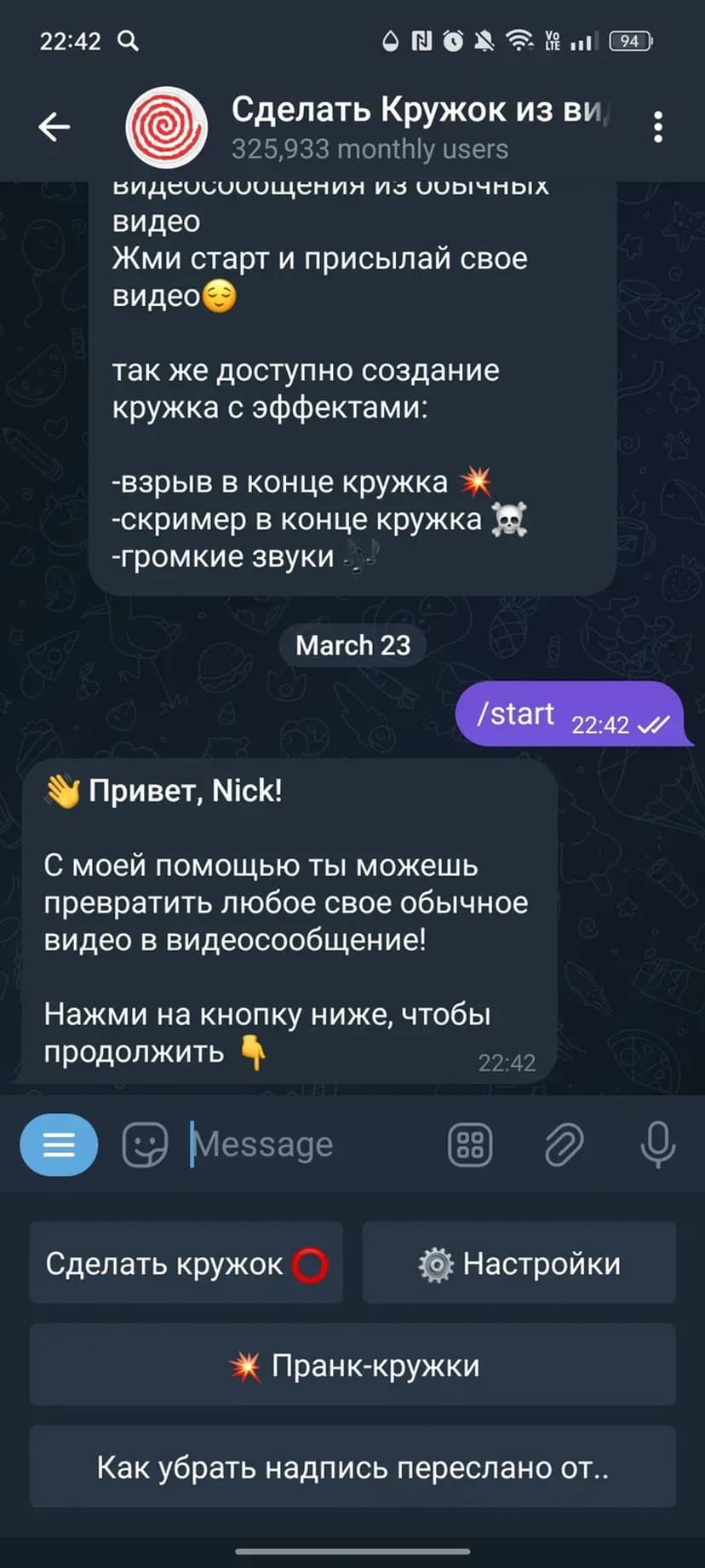 Сделать Кружок из видео 📺 превращает обычные видеоролики в круглые видеосообщения — удобный формат, который применяется в мессенджере.