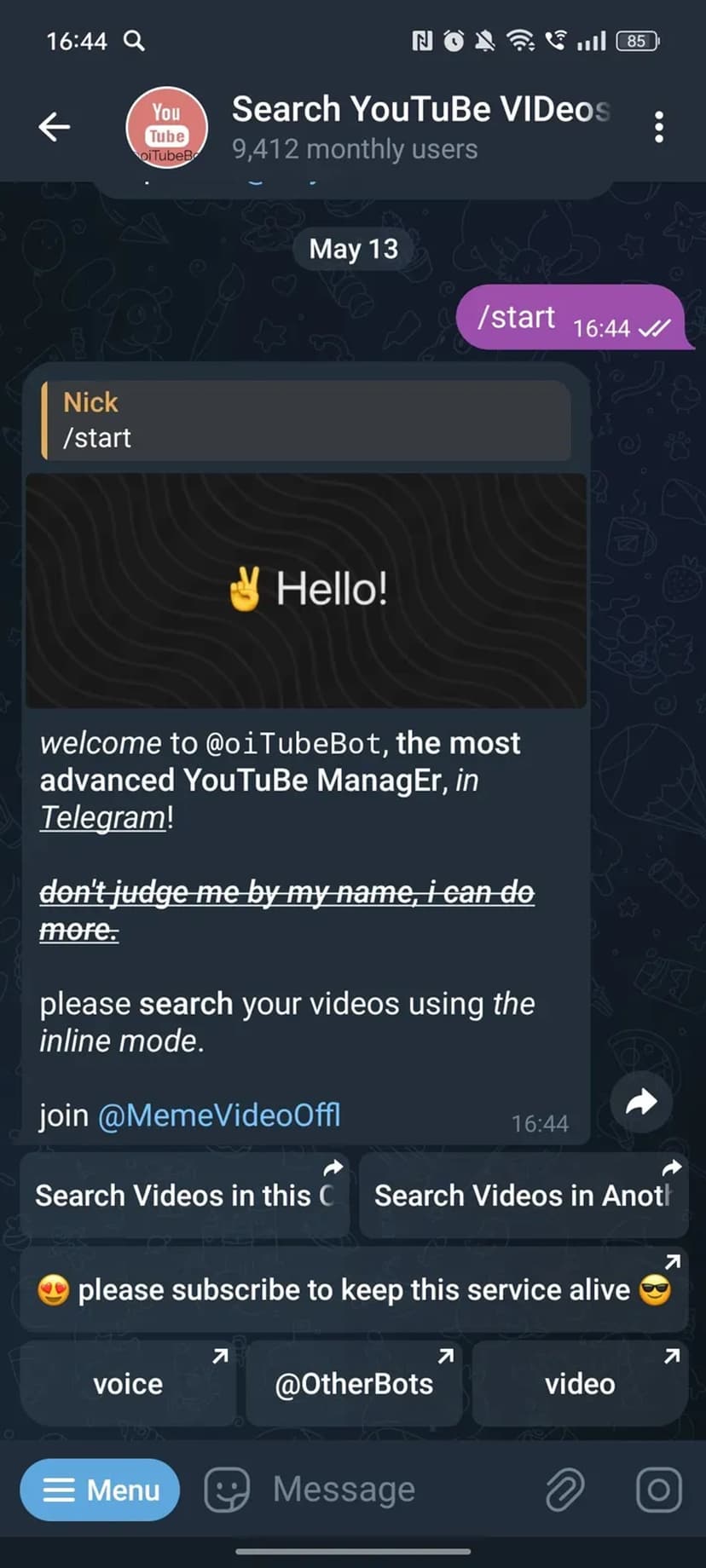 Search YouTuBe VIDeos aND DownLoad π β Telegram-Π±ΠΎΡ, ΠΊΠΎΡΠΎΡΡΠΉ ΠΏΠΎΠΌΠΎΠ³Π°Π΅Ρ Π½Π°Ρ ΠΎΠ΄ΠΈΡΡ ΡΠΎΠ»ΠΈΠΊΠΈ Π½Π° YouTube ΠΈ ΠΏΠΎΠ»ΡΡΠ°ΡΡ Π²Π°ΡΠΈΠ°Π½ΡΡ ΠΈΡ Π·Π°Π³ΡΡΠ·ΠΊΠΈ ΠΏΡΡΠΌΠΎ Π² ΡΠ°ΡΠ΅.