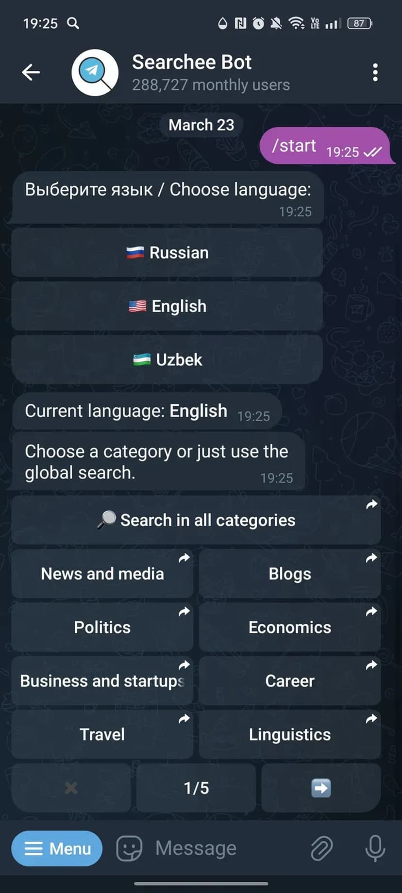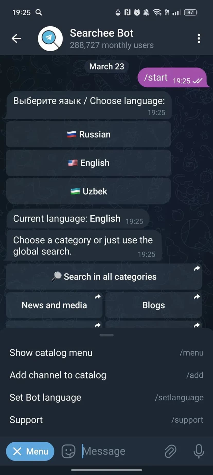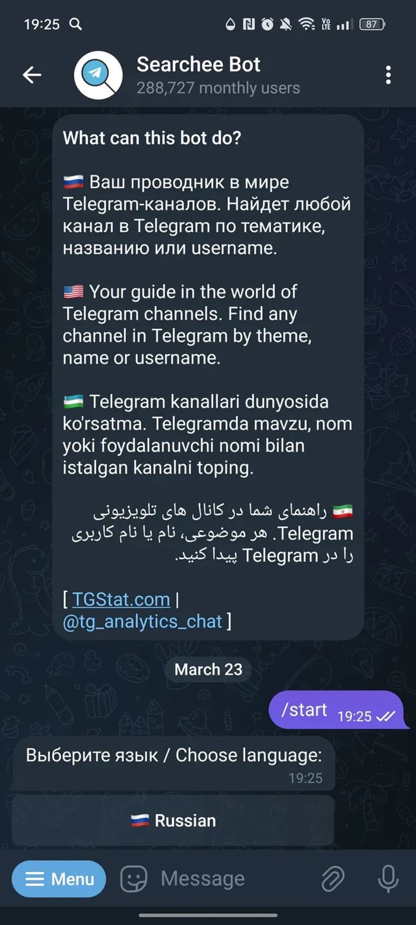 Searchee Bot помогает быстро находить и переходить к тематическим Telegram‑каналам. Поиск выполняется по ключевым словам, категориям и дополнительным фильтрам, что ускоряет поиск нужных сообществ и материалов.