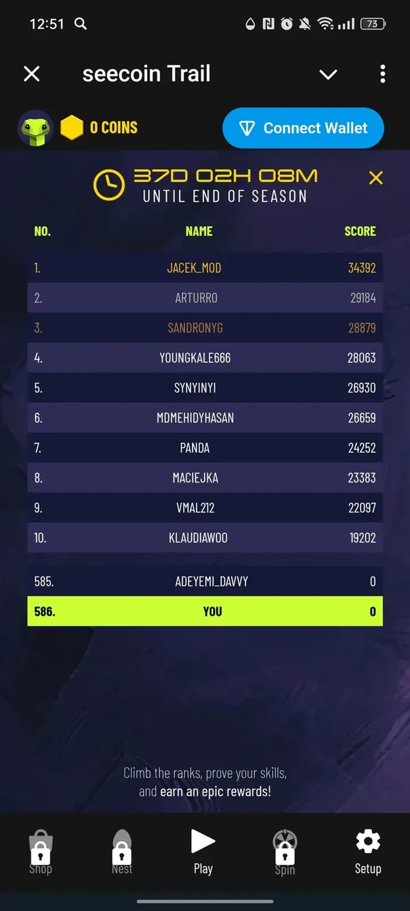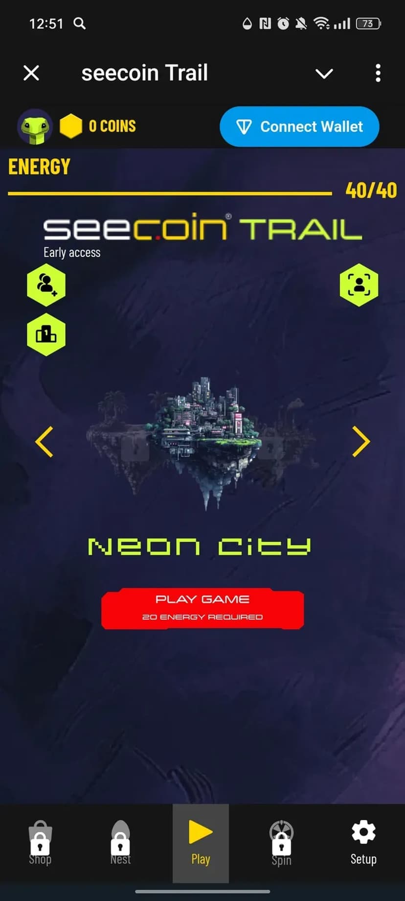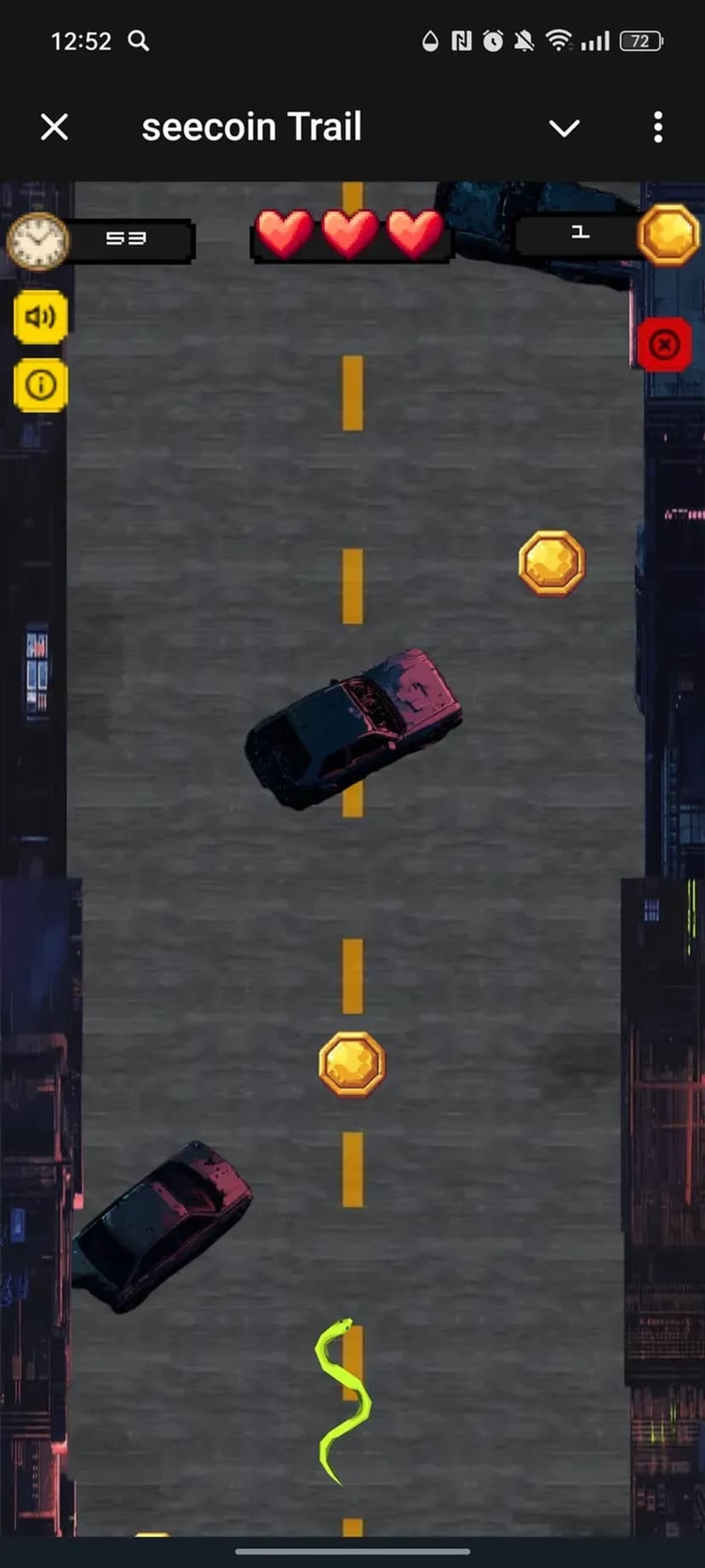 seecoin Trail — мини-игра с персонажем Sergio the Snake. Ведите героя по динамичным трейлам, собирайте монеты, обходите препятствия и набирайте очки, чтобы подняться в общем рейтинге.