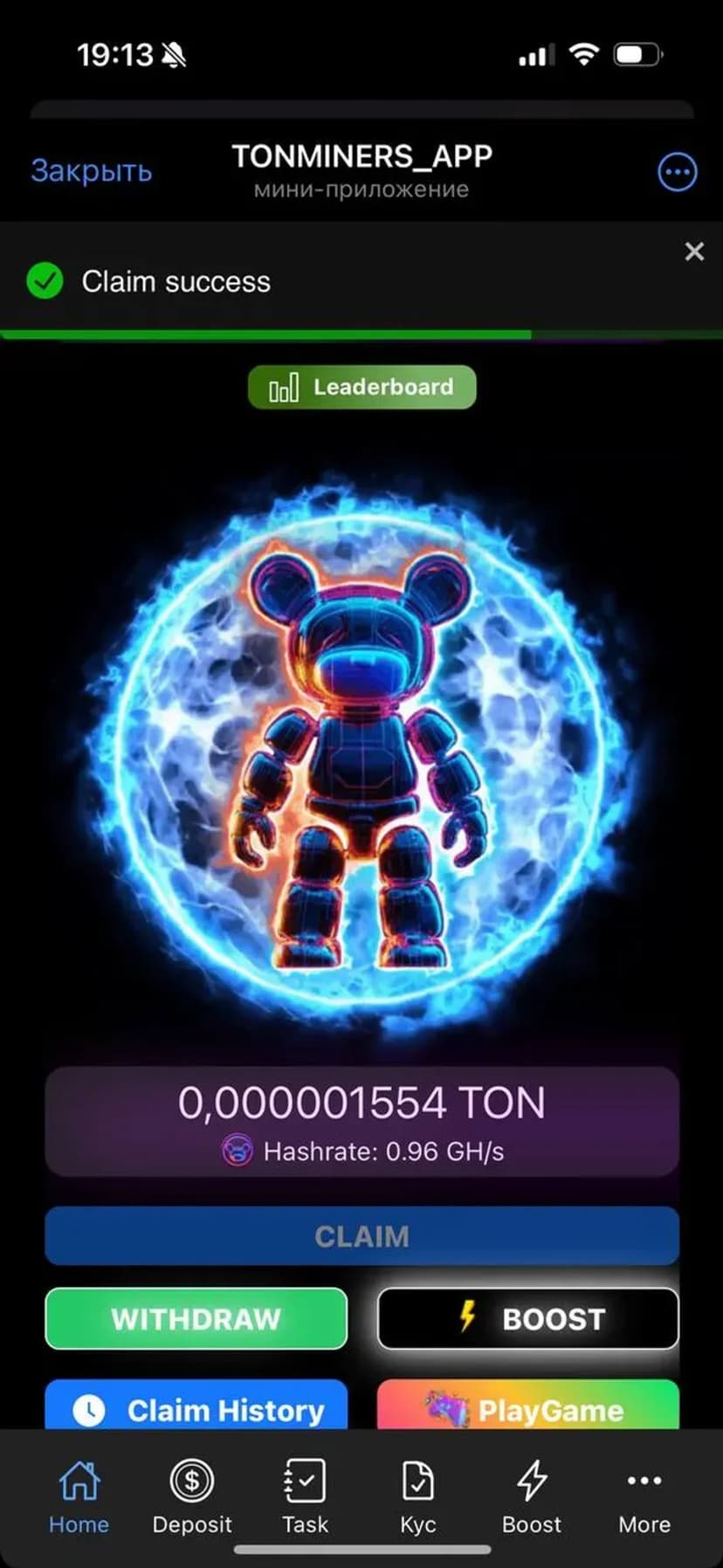 - Прозрачность и вывод — интеграция с TON обеспечивает прозрачные начисления и быстрый вывод токенов.