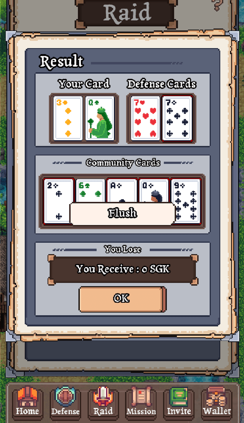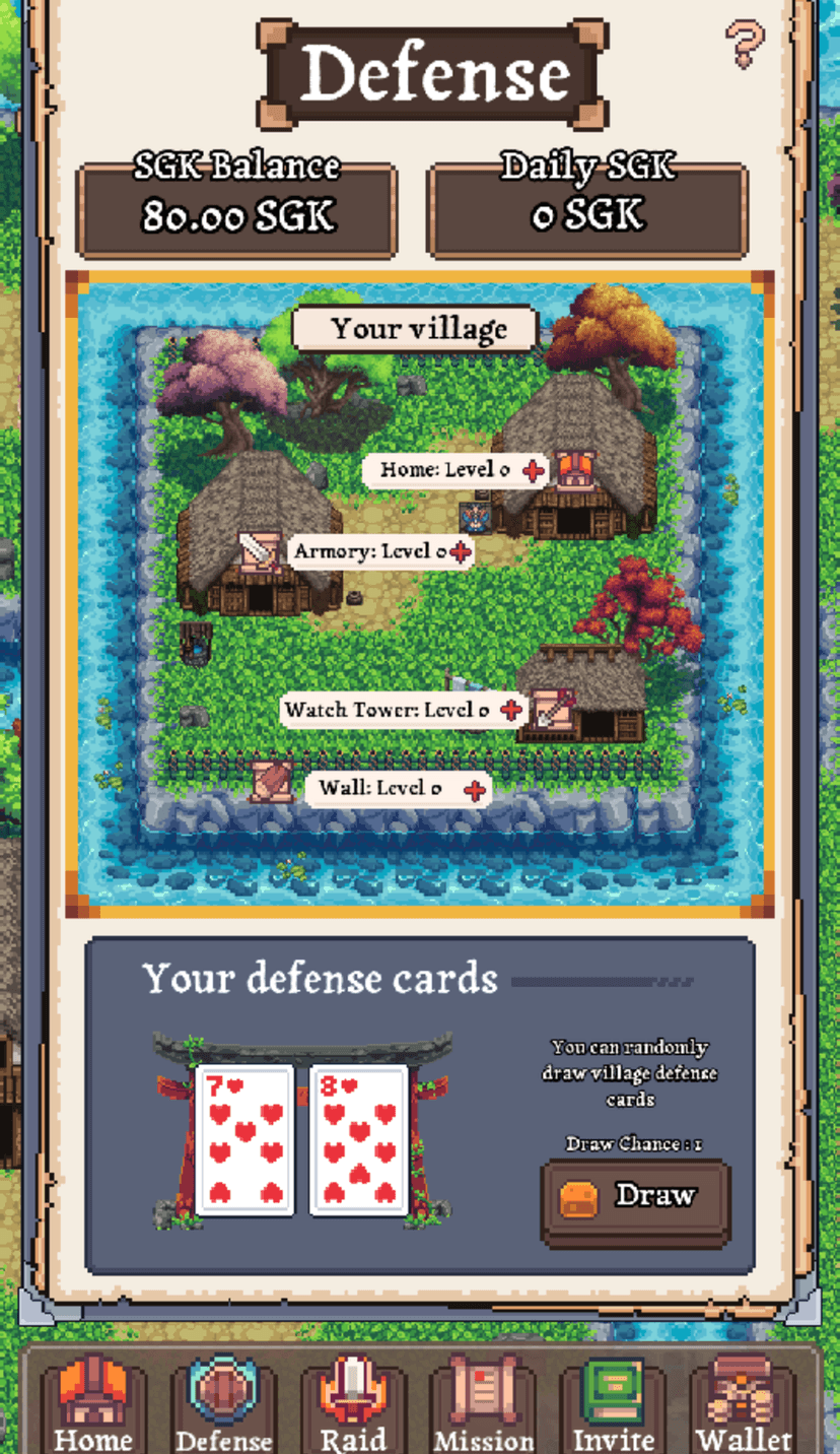 - Геймплей: пассивный майнинг, защита деревни через покерные мини‑игры и рейды для сбора ресурсов.