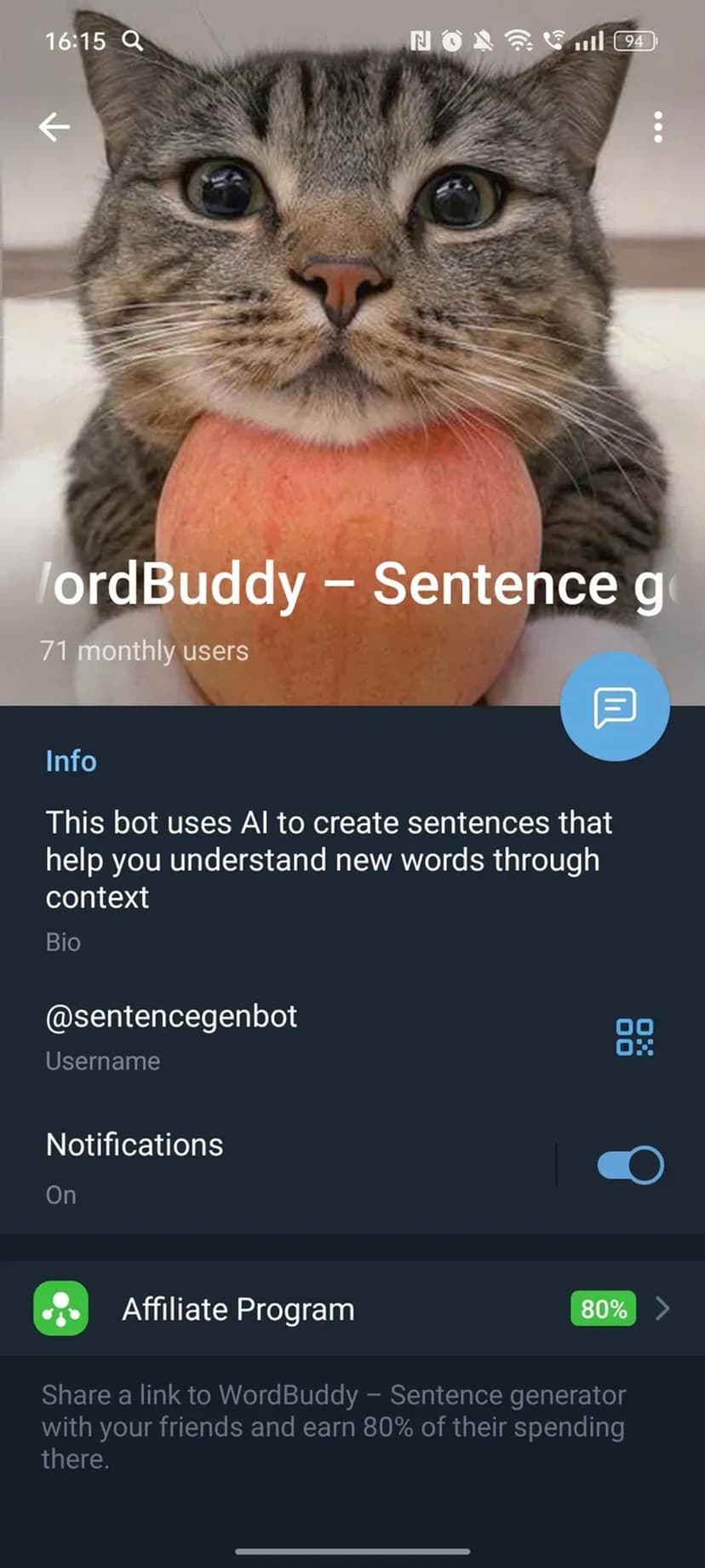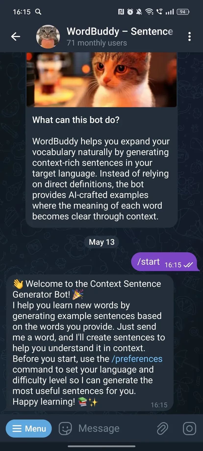 Sentence Generator создаёт примеры использования слова в естественных контекстах: достаточно отправить слово, и бот вернёт несколько предложений, иллюстрирующих разные варианты употребления.