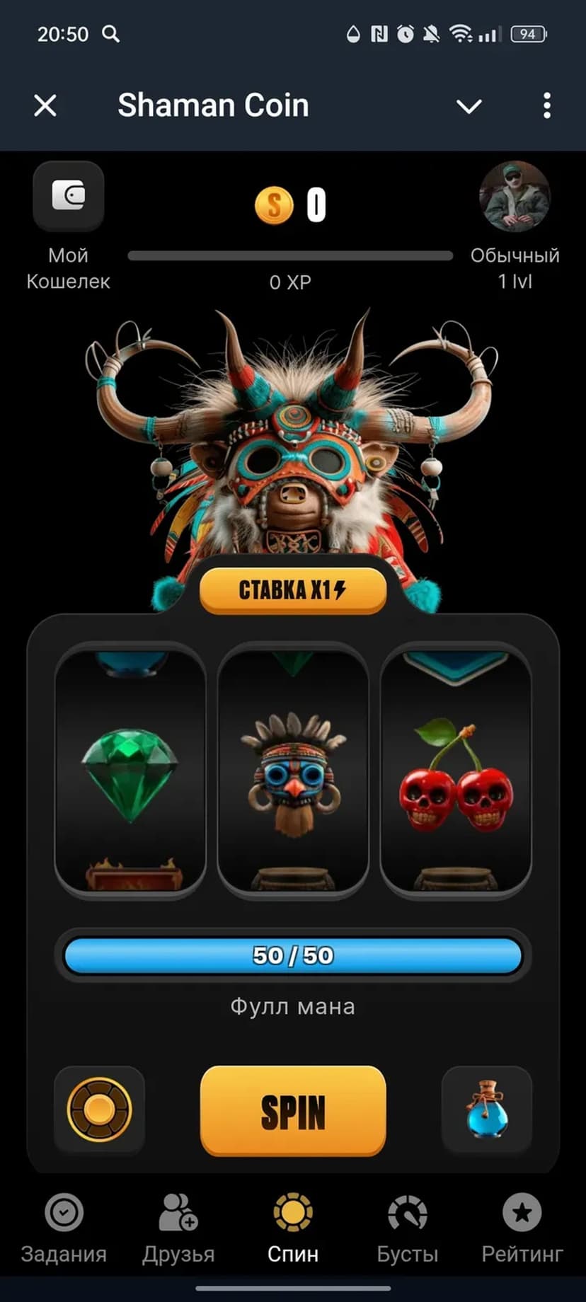 Shaman Coin предлагает механику spin-to-earn прямо в Telegram: запускайте игровой автомат в чате, совершайте вращения барабанов и получайте SCoins при выигрышах.