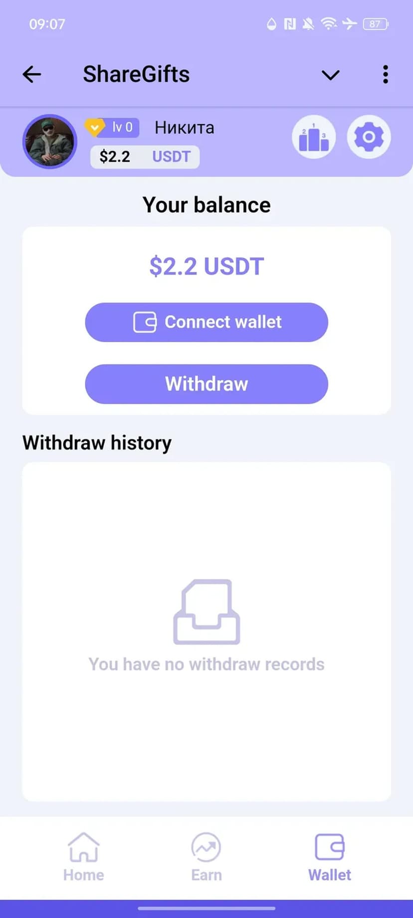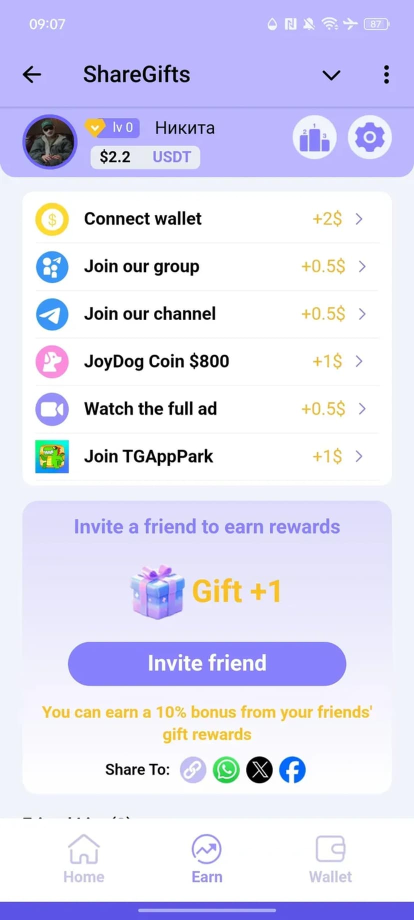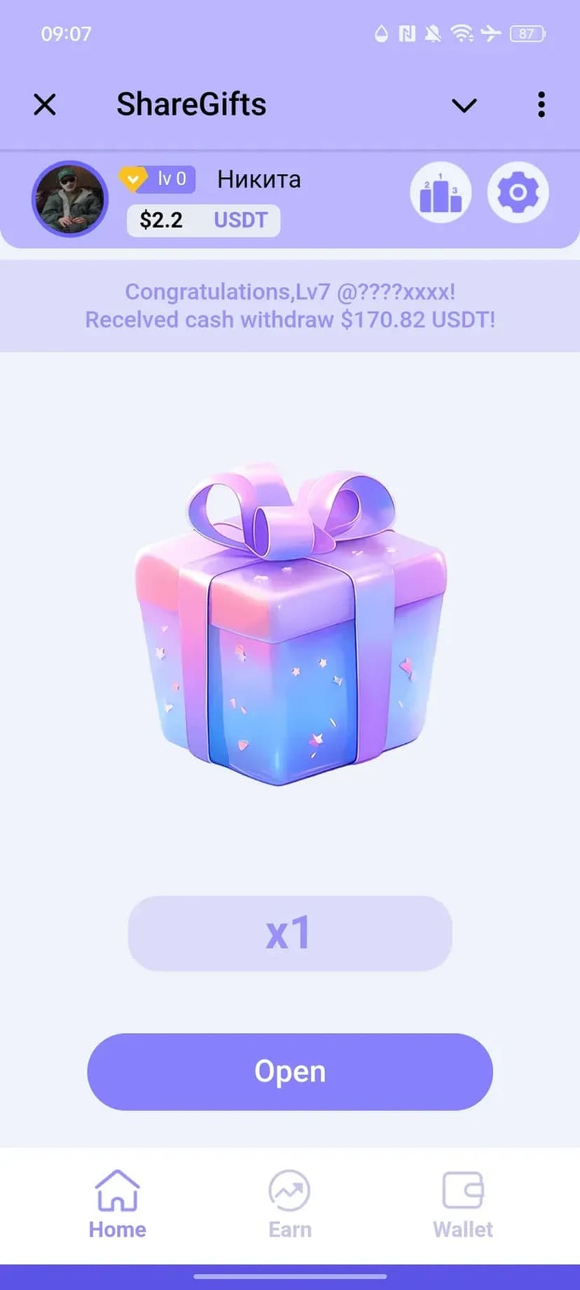 ShareGifts позволяет ежедневно открывать бесплатные подарочные коробки и получать случайные криптовалютные вознаграждения. Начисления приходят в $USDT или TON и сохраняются на внутреннем балансе.
