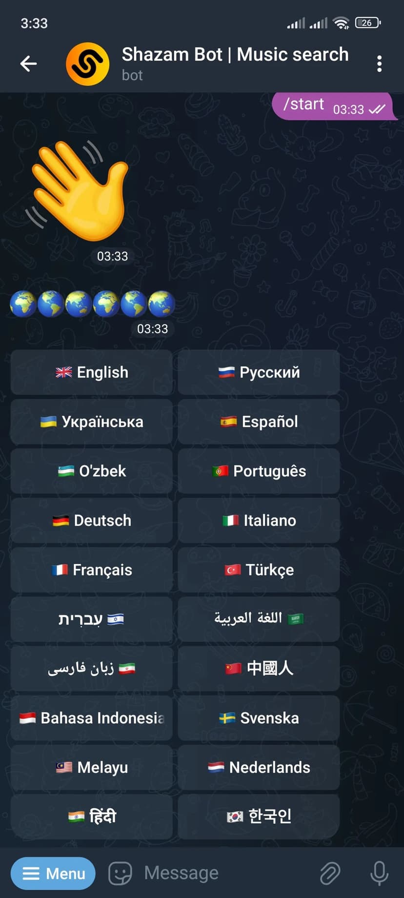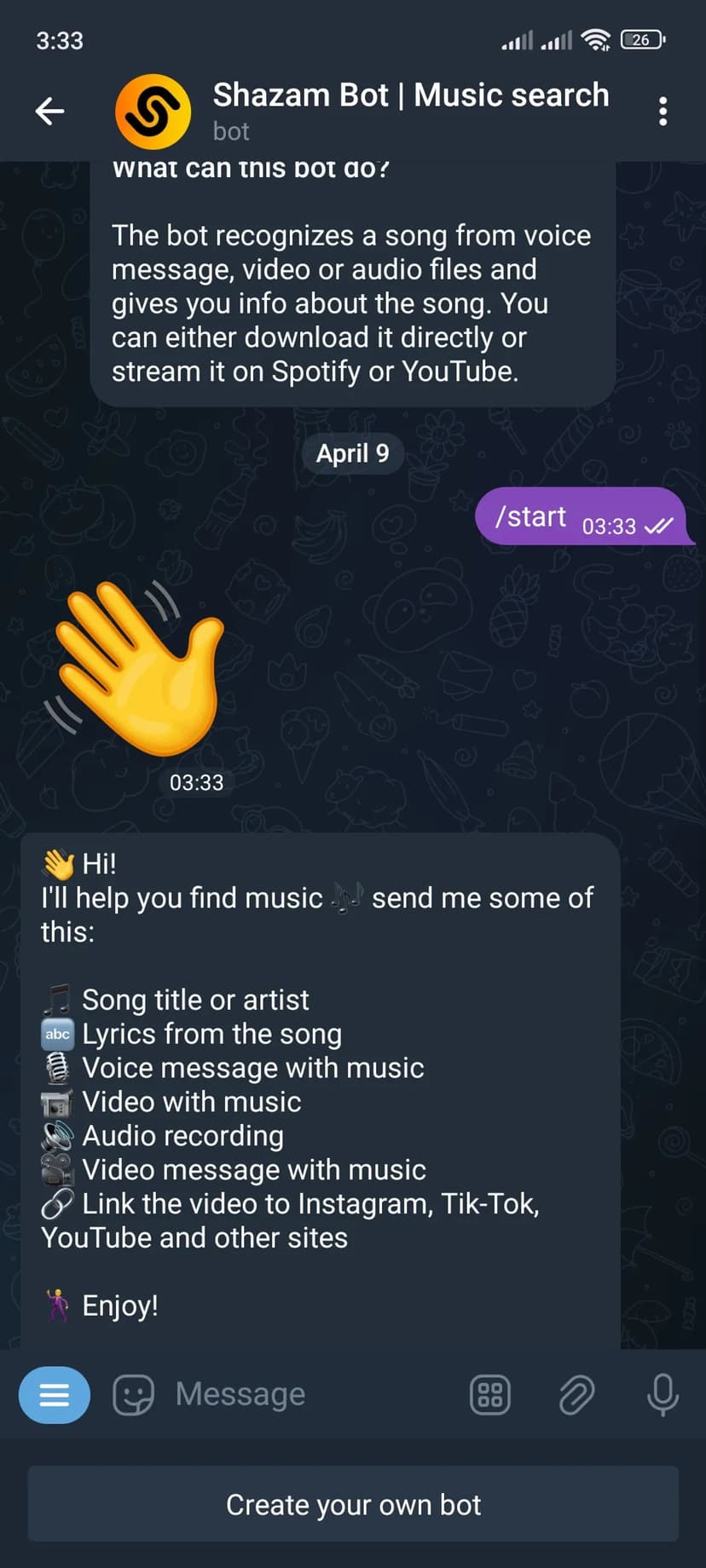 SHAZAM Bot | Music search распознаёт музыку по аудиофрагменту, голосовому сообщению или видеозаписи и выдаёт основную информацию о композиции.