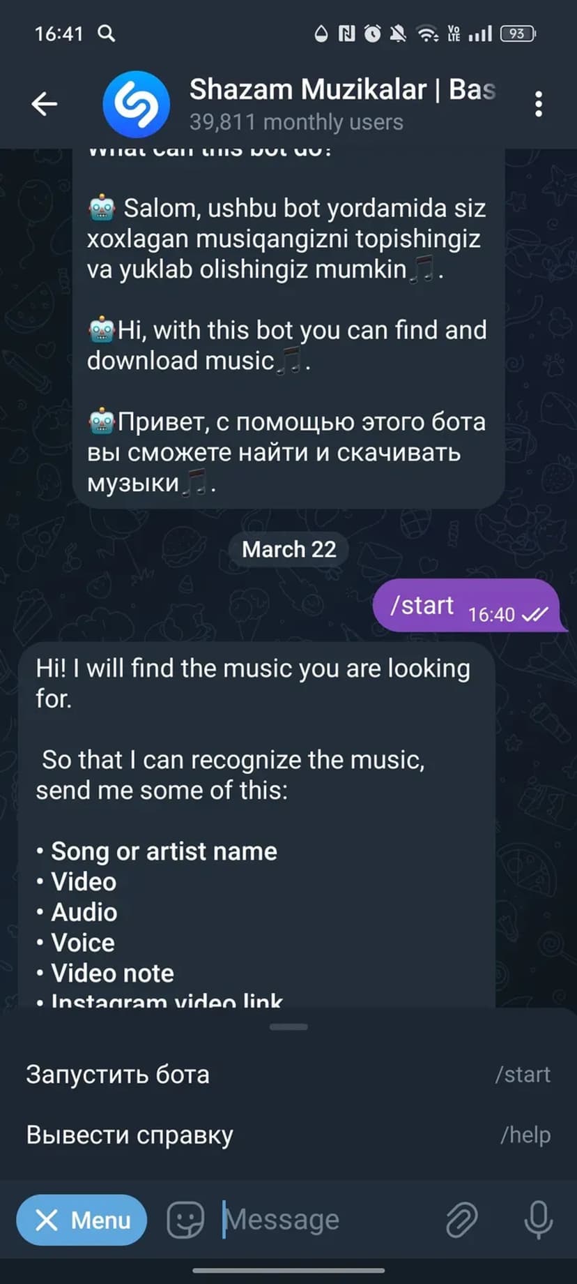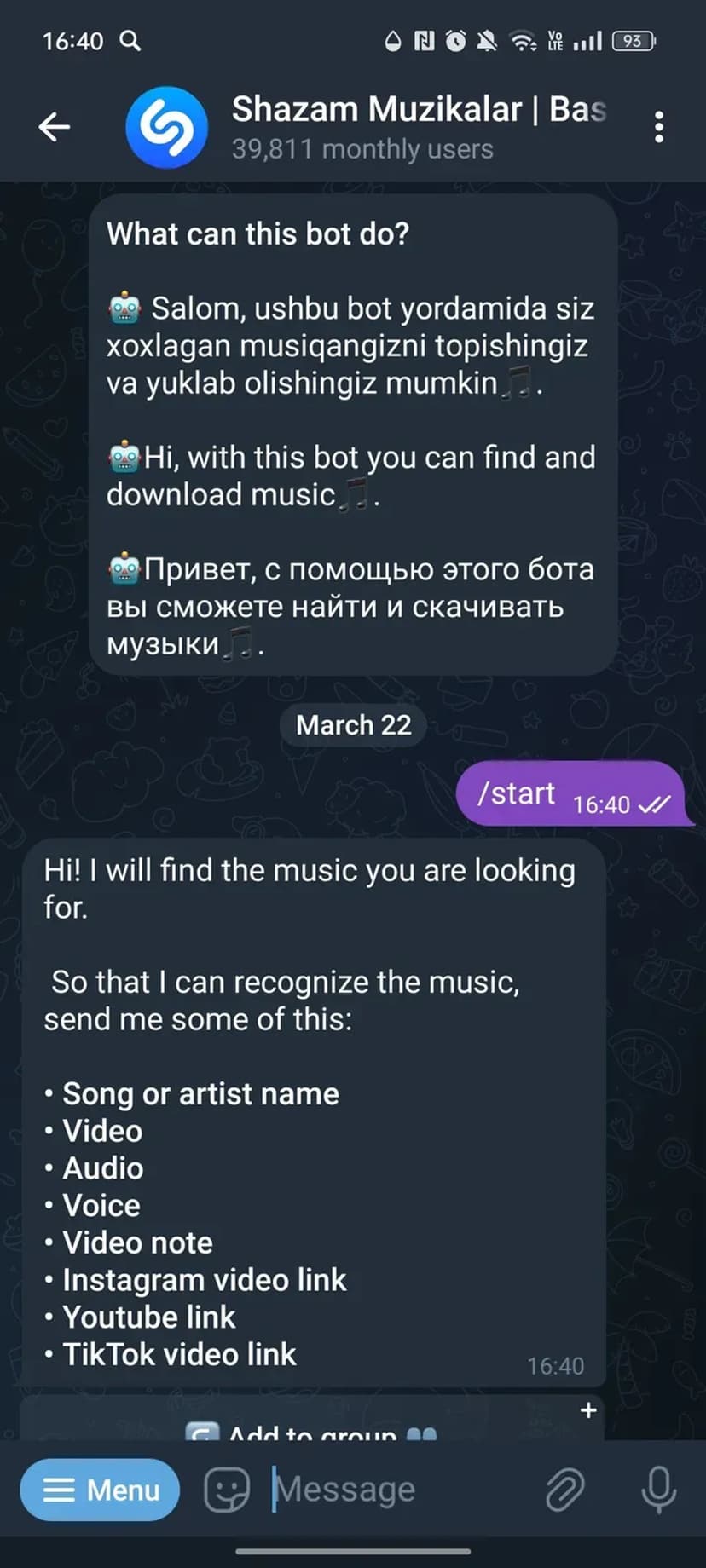 Shazam Muzikalar | Bass Musiqalar | Xamdam | Jaloliddin распознаёт музыку по разным источникам: можно отправить название песни или имя исполнителя, аудио- или видеофайл, голосовое сообщение, а также ссылку на ролик из Instagram, YouTube или TikTok.