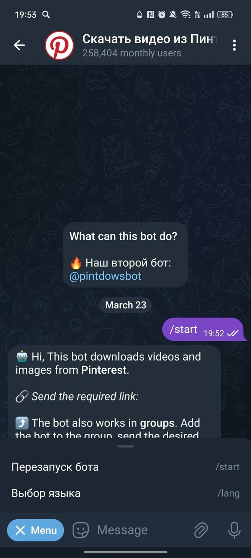 Загрузите видео и изображения из Pinterest прямо в чат Telegram. Отправьте ссылку на публикацию — бот автоматически присылает медиафайл в диалог.