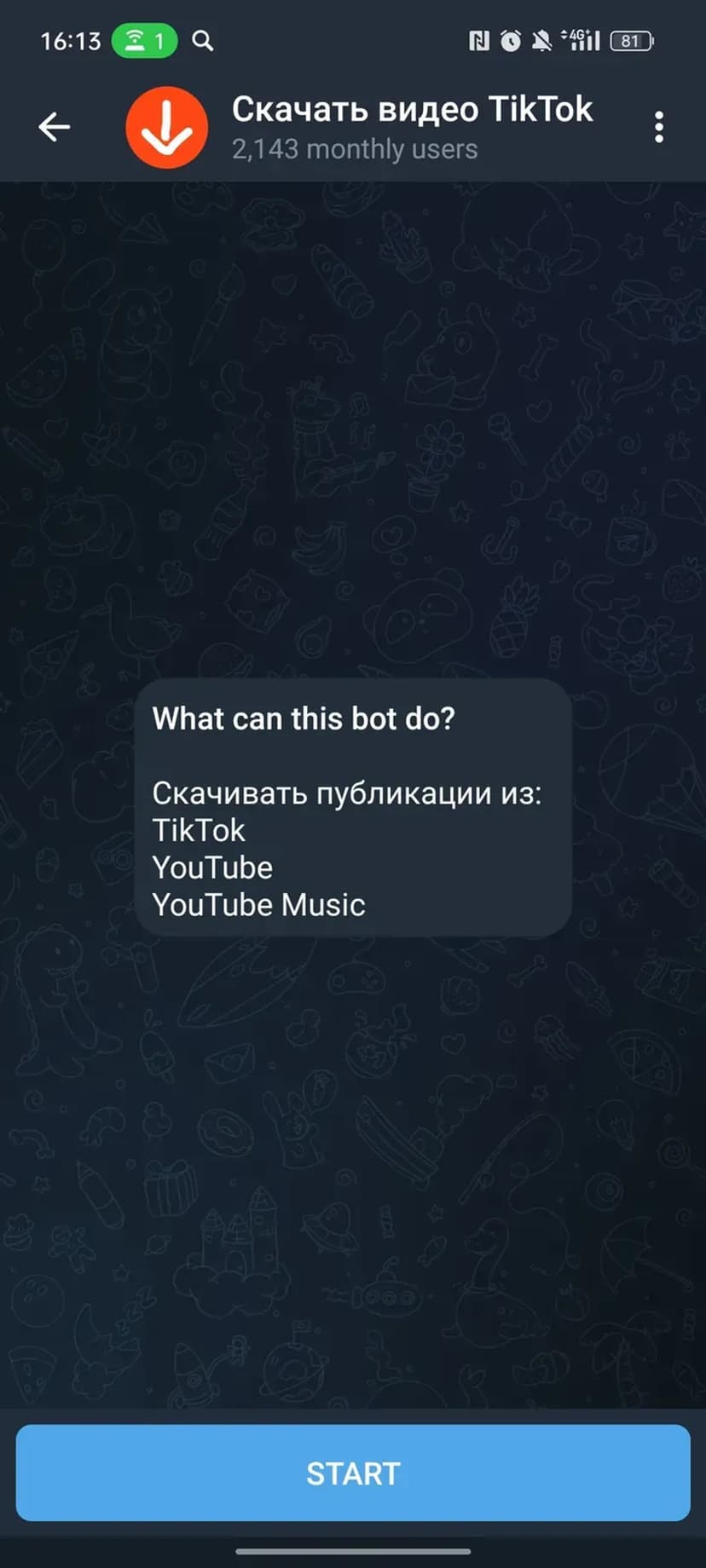 *Нажимая "Открыть в Telegram", вы перейдете к приложению Скачать видео TikTok в мессенджере Telegram