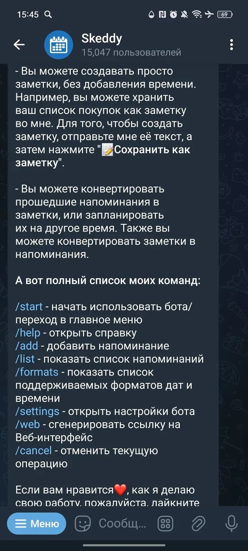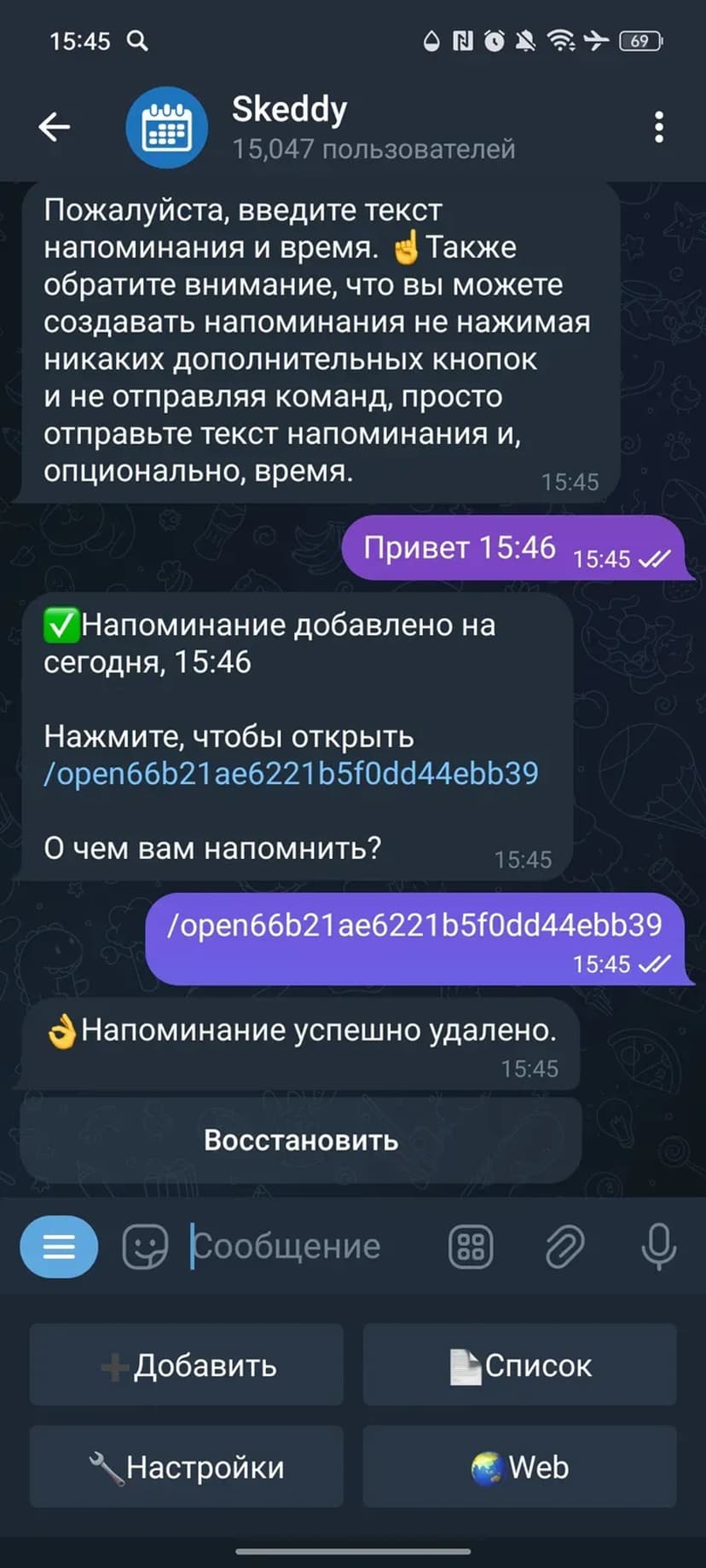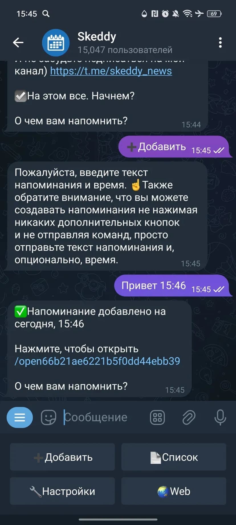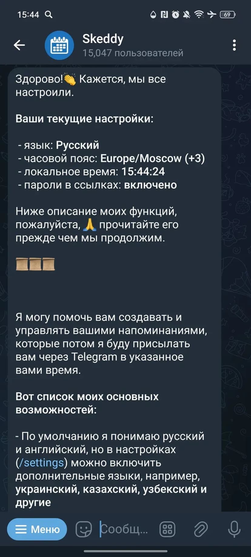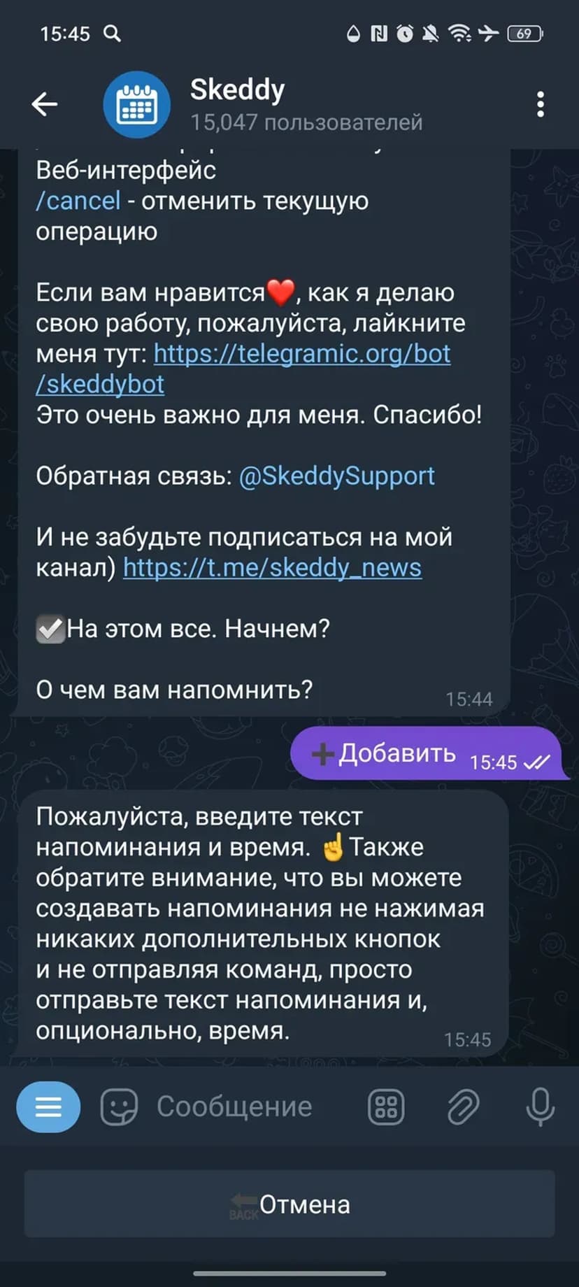 Skeddy упрощает создание и управление напоминаниями через диалог с ботом. Напоминание можно задать в свободной форме — система распознаёт дату и время и отправит уведомление в указанный момент.