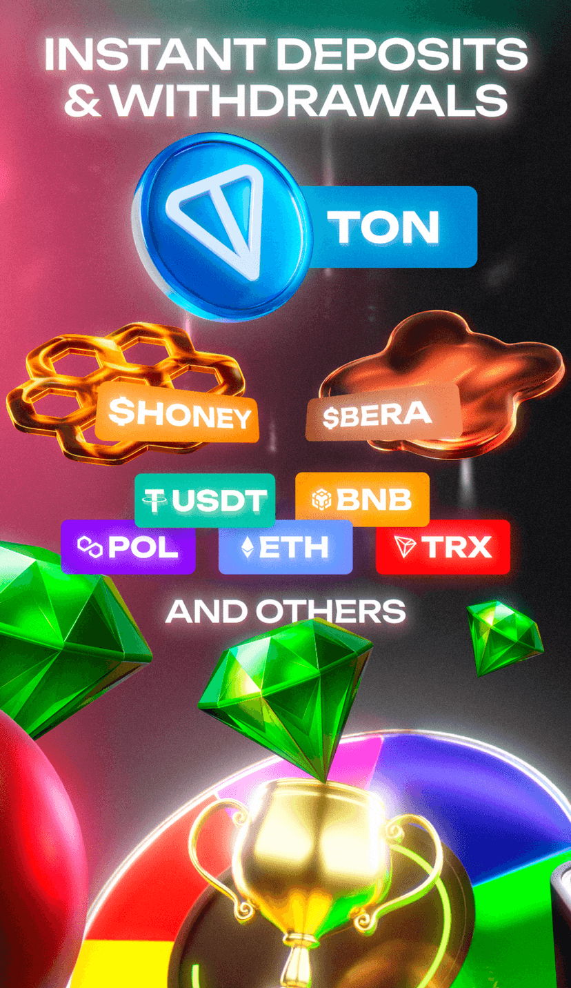 Slot.win предоставляет доступ к пяти быстрым азартным играм: Crash, Dice, Mines, Battle и Platforms. Поддерживаются платежи в TON и более чем 12 популярных криптовалютах, включая USDT, ETH, BNB, TRX, BTC и SOL.