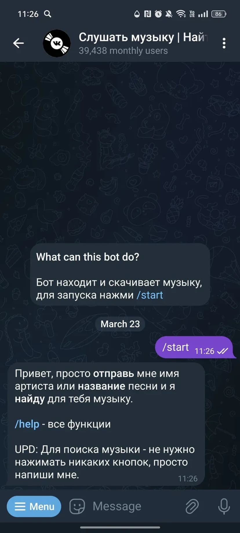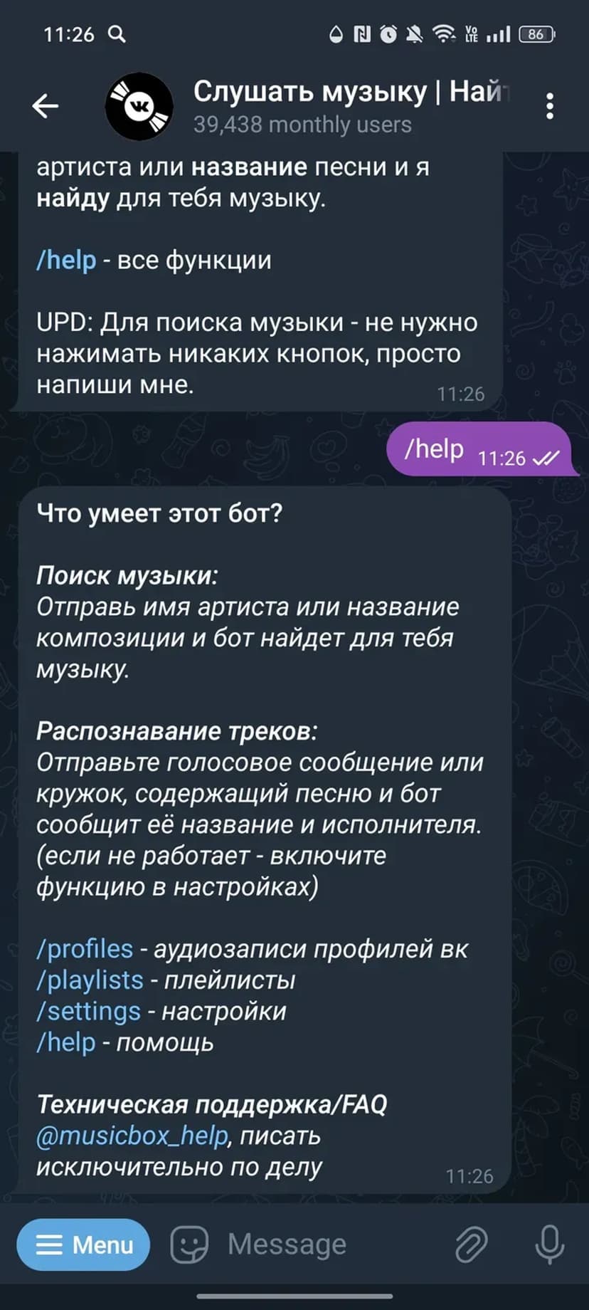 Слушать музыку | Найти помогает быстро находить треки и определять композиции прямо в чате Telegram. Сервис ищет музыку по названию или имени исполнителя и распознаёт мелодии по голосовым сообщениям и аудиофрагментам.