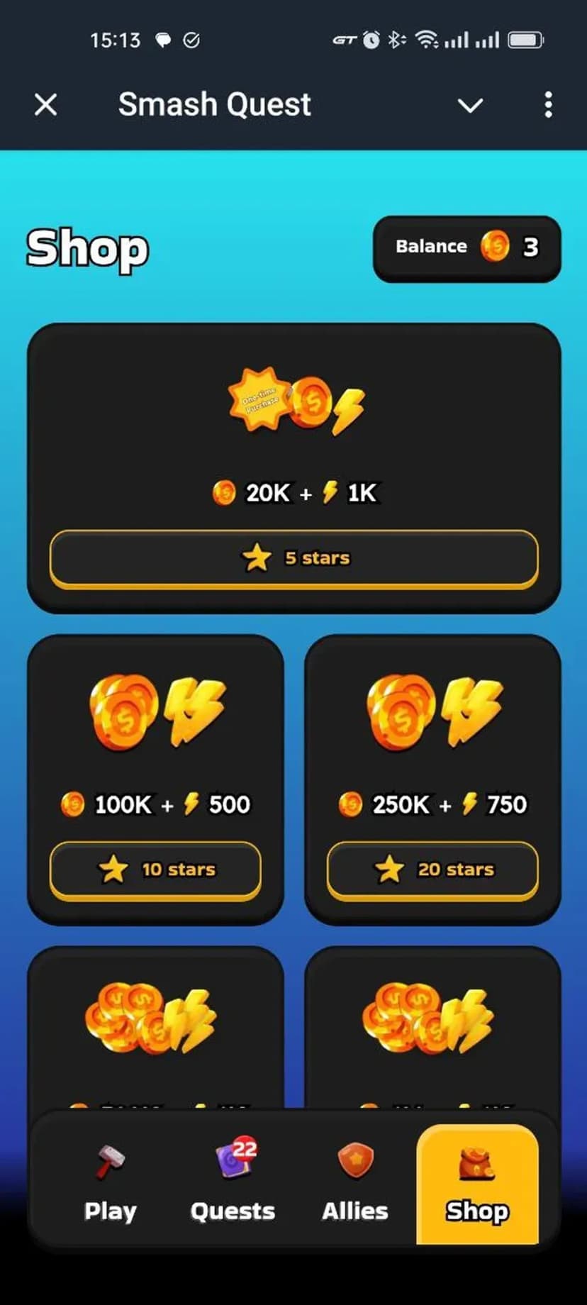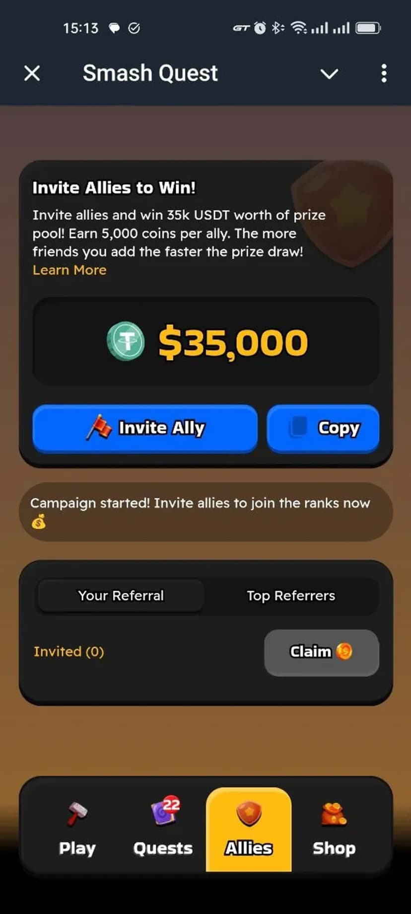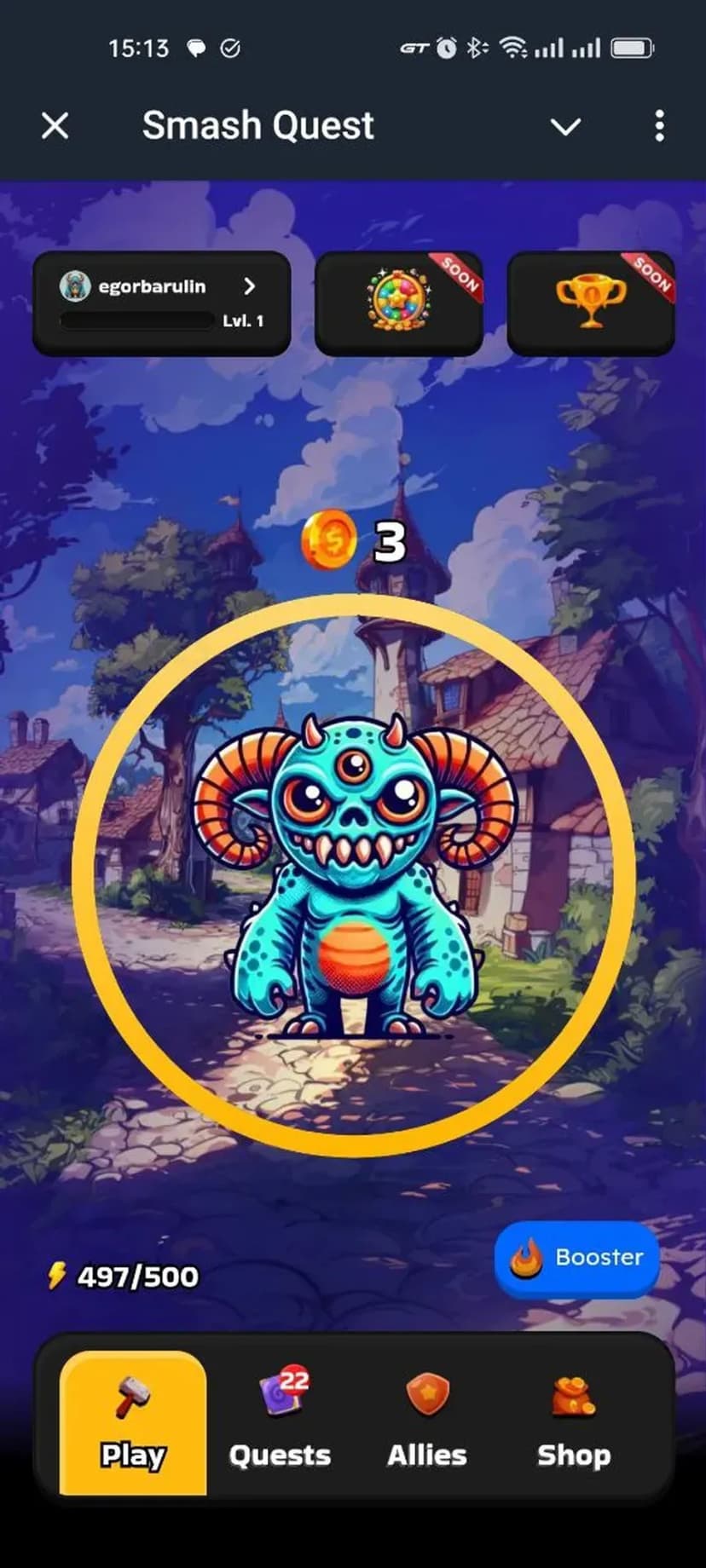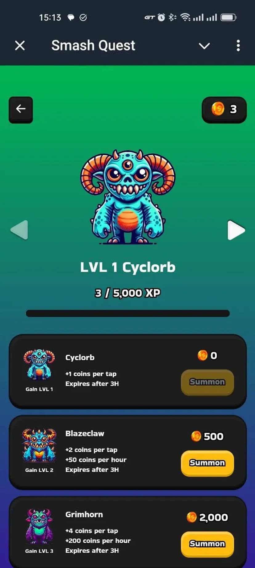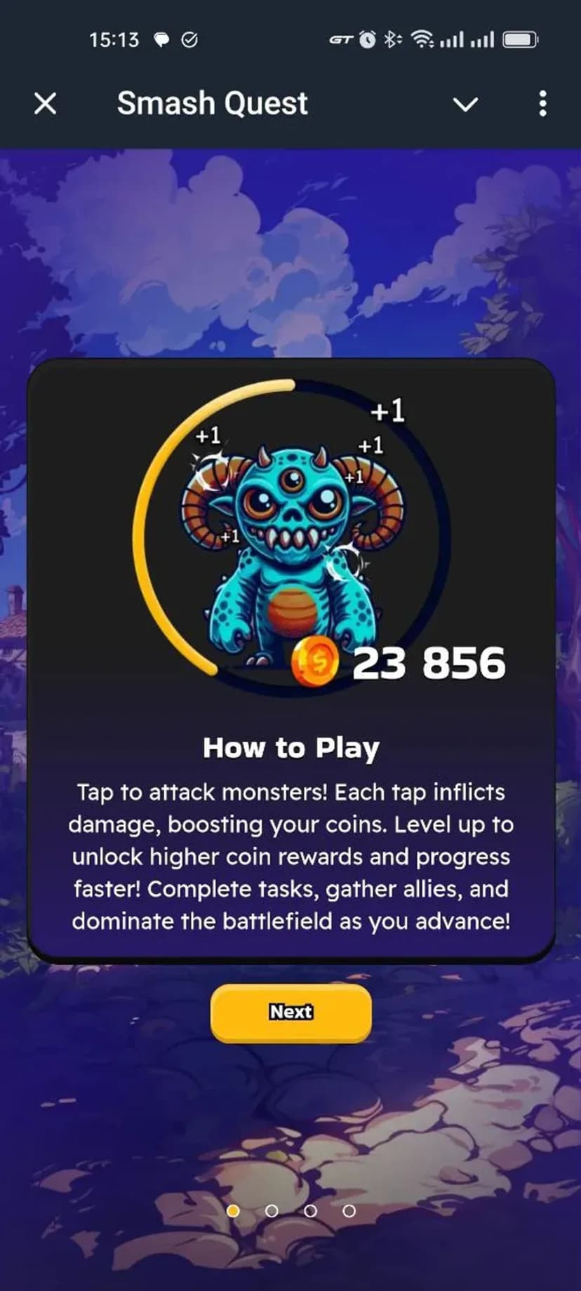 Smash Quest — динамичный кликер, где каждое нажатие приносит внутриигровую валюту $SMASH. Игроки уничтожают монстров и копят ресурсы, чтобы открывать новых противников и усиливать персонажа.