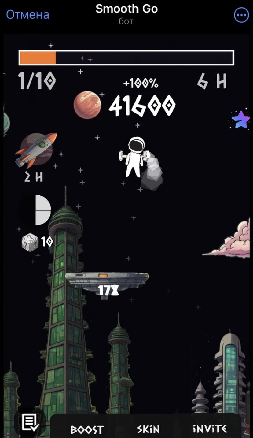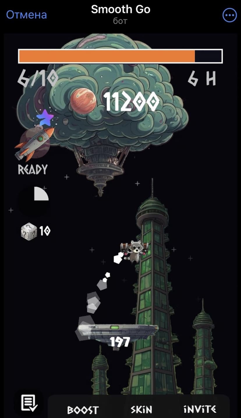 Smooth Go :x — аркадная мини‑игра в Telegram, где игрок управляет персонажем, перепрыгивает с платформы на платформу и собирает проектные токены. Цель — не упасть и набрать как можно больше очков, соревнуясь с друзьями.