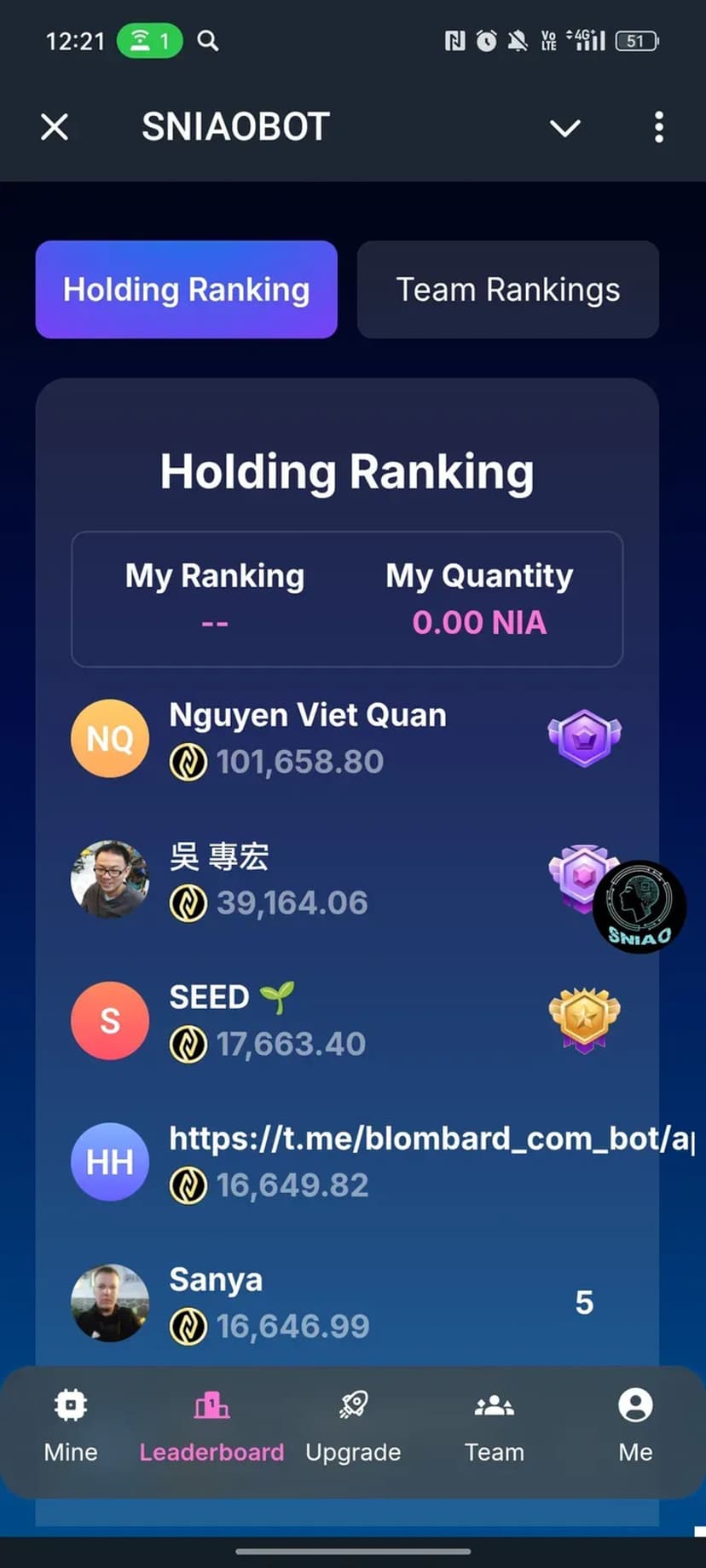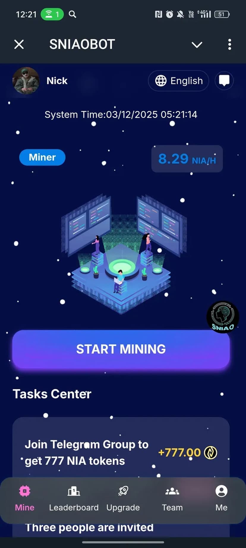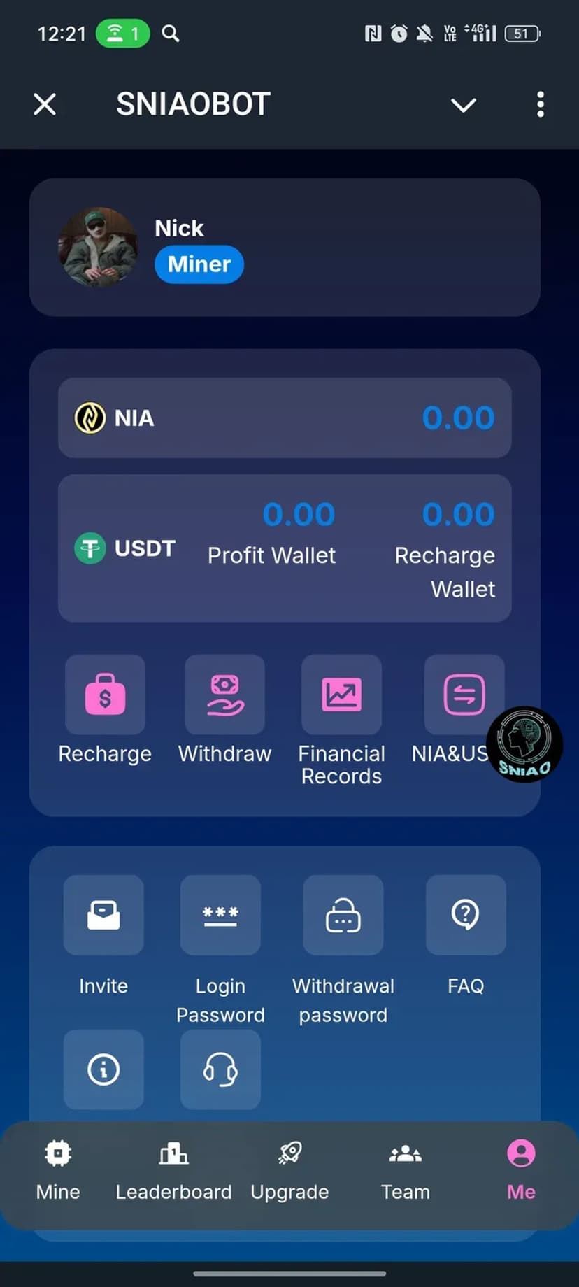 SNIAOBOT позволяет получать токены NIA за выполнение ежедневных и специальных заданий, а также за привлечение новых участников. Накопленные токены можно обменять на USDT через PancakeSwap и вывести на подключённый криптокошелёк.