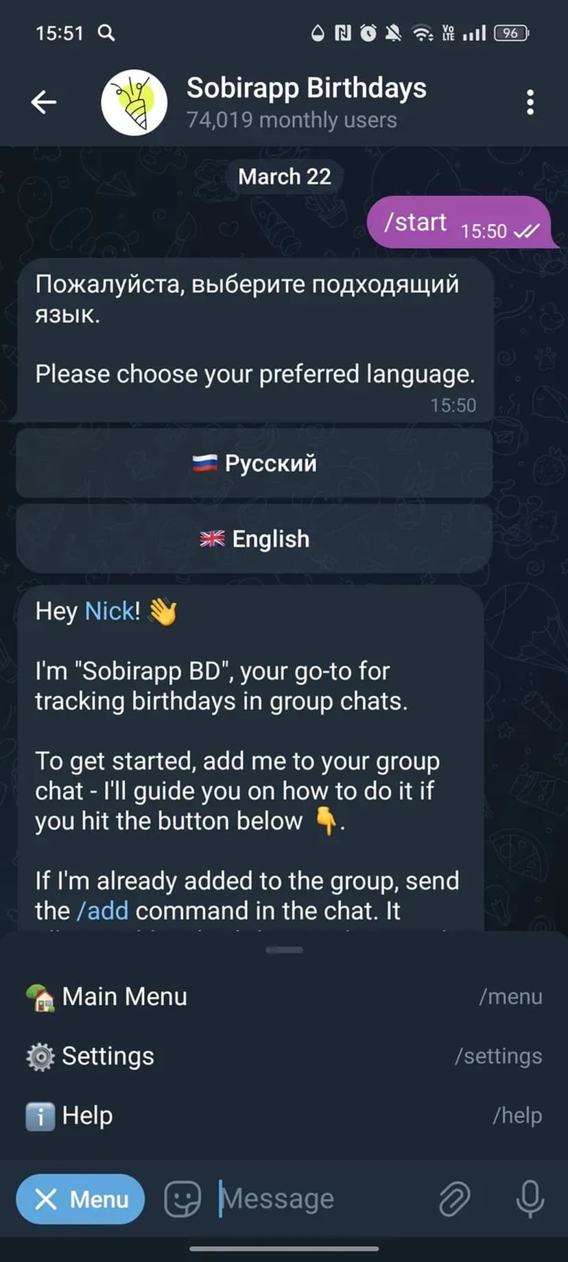 - Автопубликация: в нужный день бот отправляет поздравление в групповой чат.