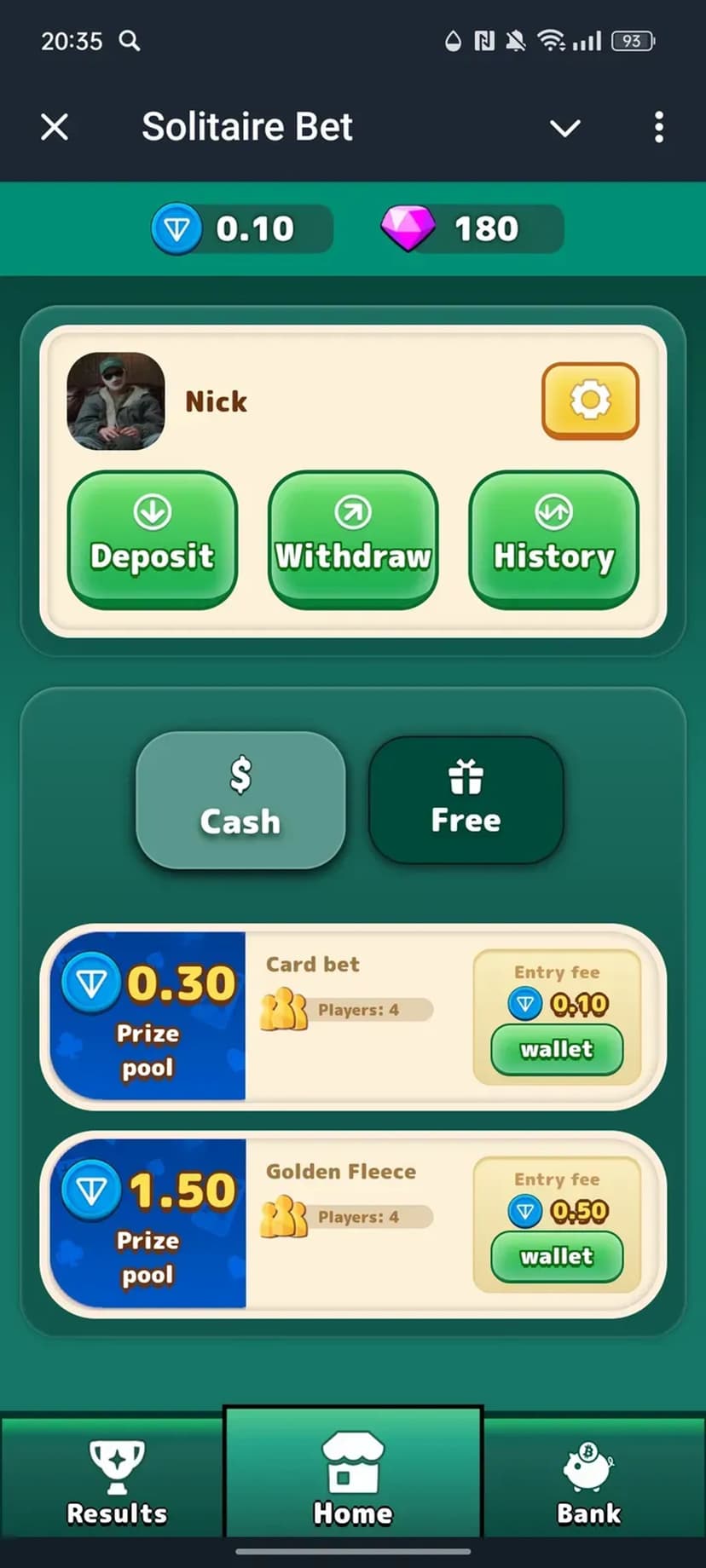 Solitaire Bet предлагает соревновательный пасьянс с возможностью выиграть реальные денежные призы. В интерфейсе доступен список турниров, личный баланс и профиль; вход выполняется через Telegram‑аккаунт без отдельной регистрации.