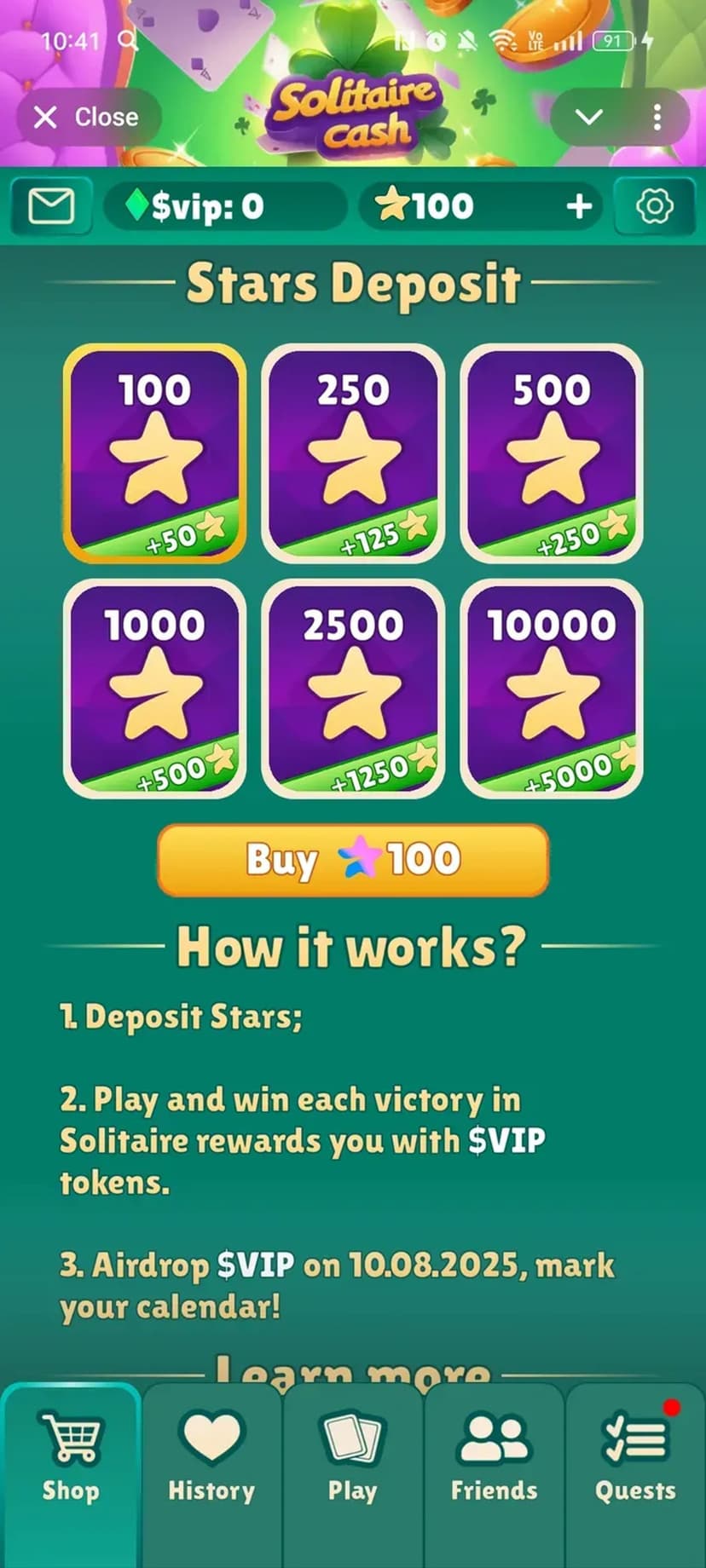 Solitaire $VIP — классический пасьянс с встроенной системой вознаграждений: проходите раунды и получайте внутреннюю валюту $VIP.