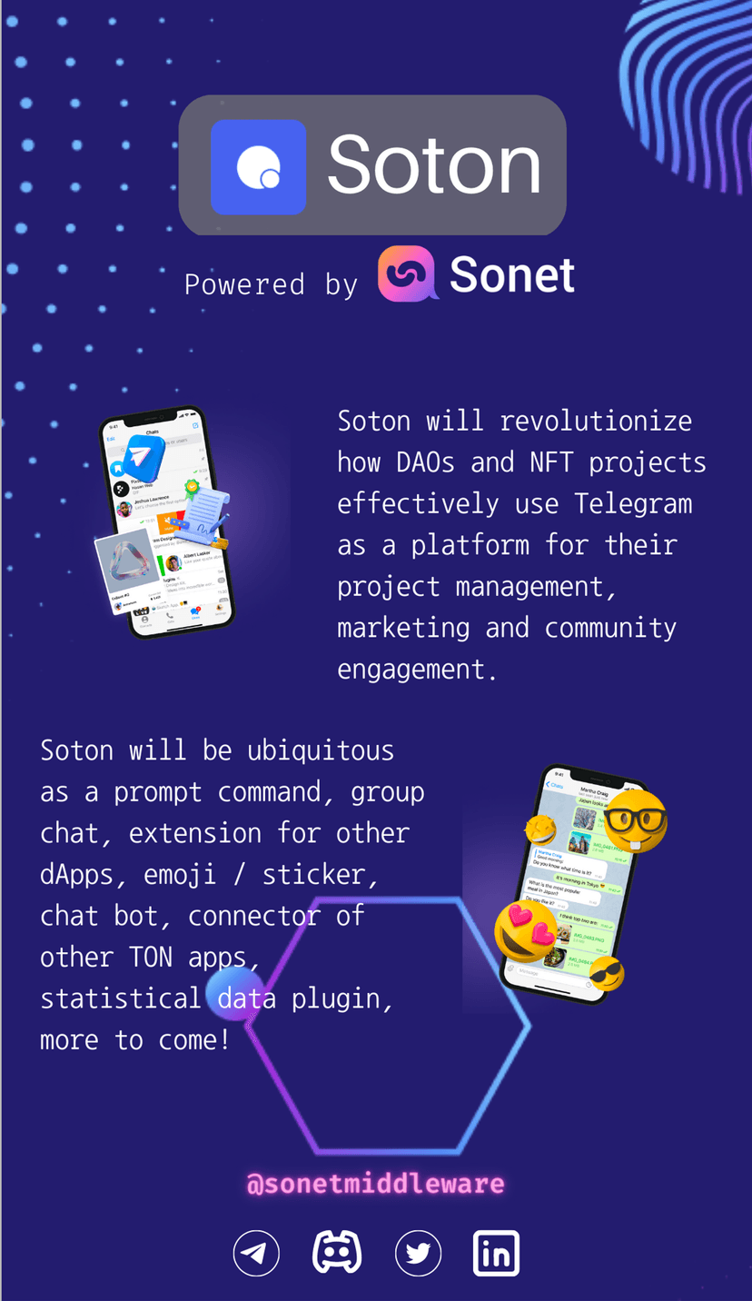 Sonet — open-source middleware для встраивания Web3-функций в привычные Web2-платформы, включая Telegram. Платформа предоставляет набор инструментов и SDK для разработки децентрализованных приложений (dApps) и взаимодействия с блокчейнами TON, Flow, Polygon и Ethereum.