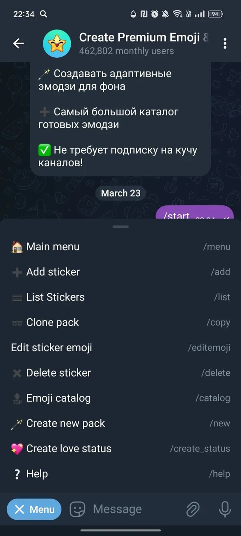 - Бот вырезает фон, оптимизирует размер и приводит файл к стандартам Telegram для премиум‑эмодзи и стикеров.