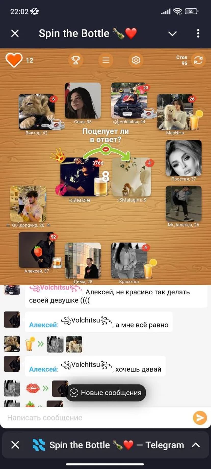 Spin the Bottle — цифровая версия классической «бутылочки», адаптированная для общения и знакомств в Telegram. Бутылка случайным образом выбирает собеседника, после чего игроки решают, отправить виртуальный поцелуй или продолжить переписку.
