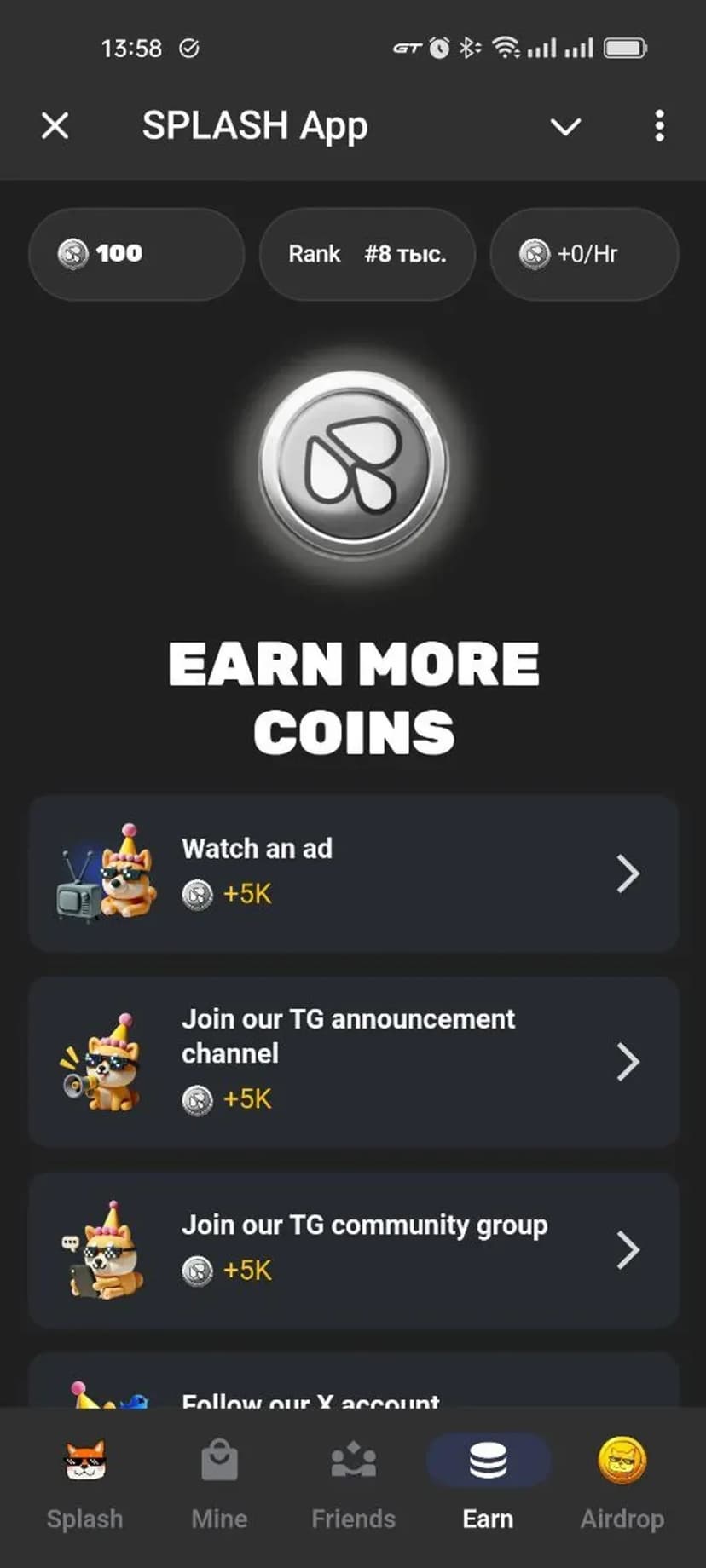 SPLASH App объединяет игровые механики и вознаграждения: выполняйте квесты, приглашайте друзей и накапливайте внутренняя монеты, чтобы подниматься в общем рейтинге и претендовать на получение SPLASH‑токенов через airdrop.