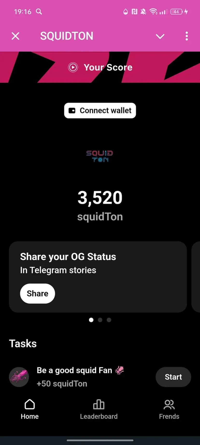 Майнинг Squid TON: дашборд с балансом, запуск/остановка, вывод средств и приглашения.