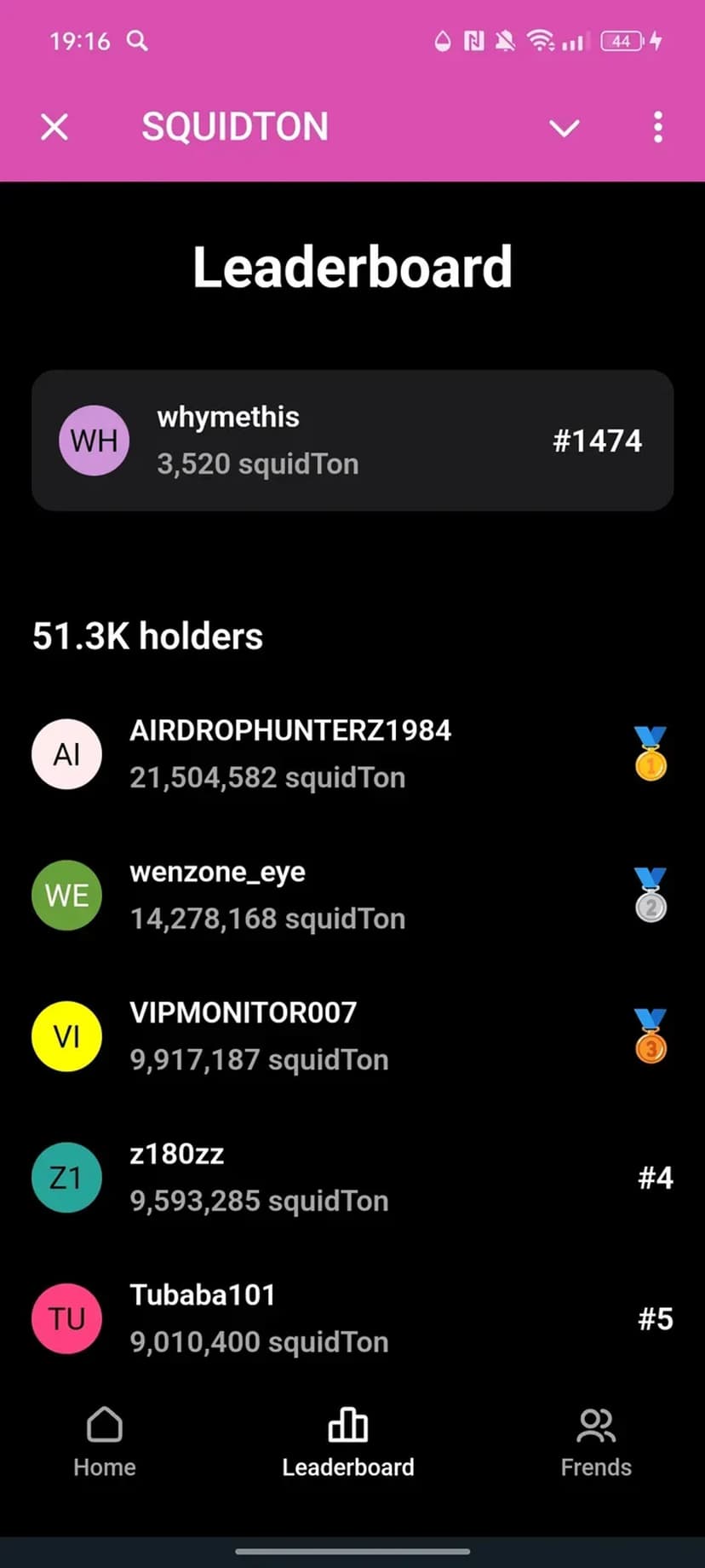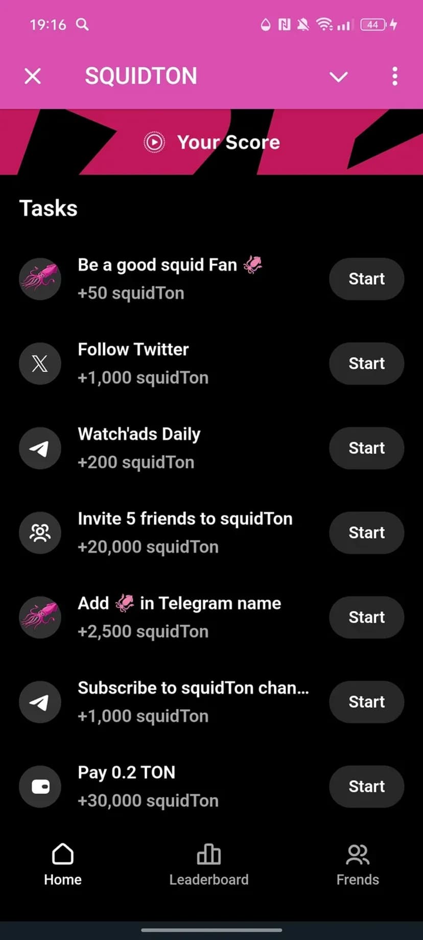 SQUIDTON предоставляет возможность майнить Squid TON прямо в мессенджере: компактный дашборд показывает баланс токенов, текущий статус майнинга и основные действия — запуск/остановка, вывод средств и приглашение друзей.