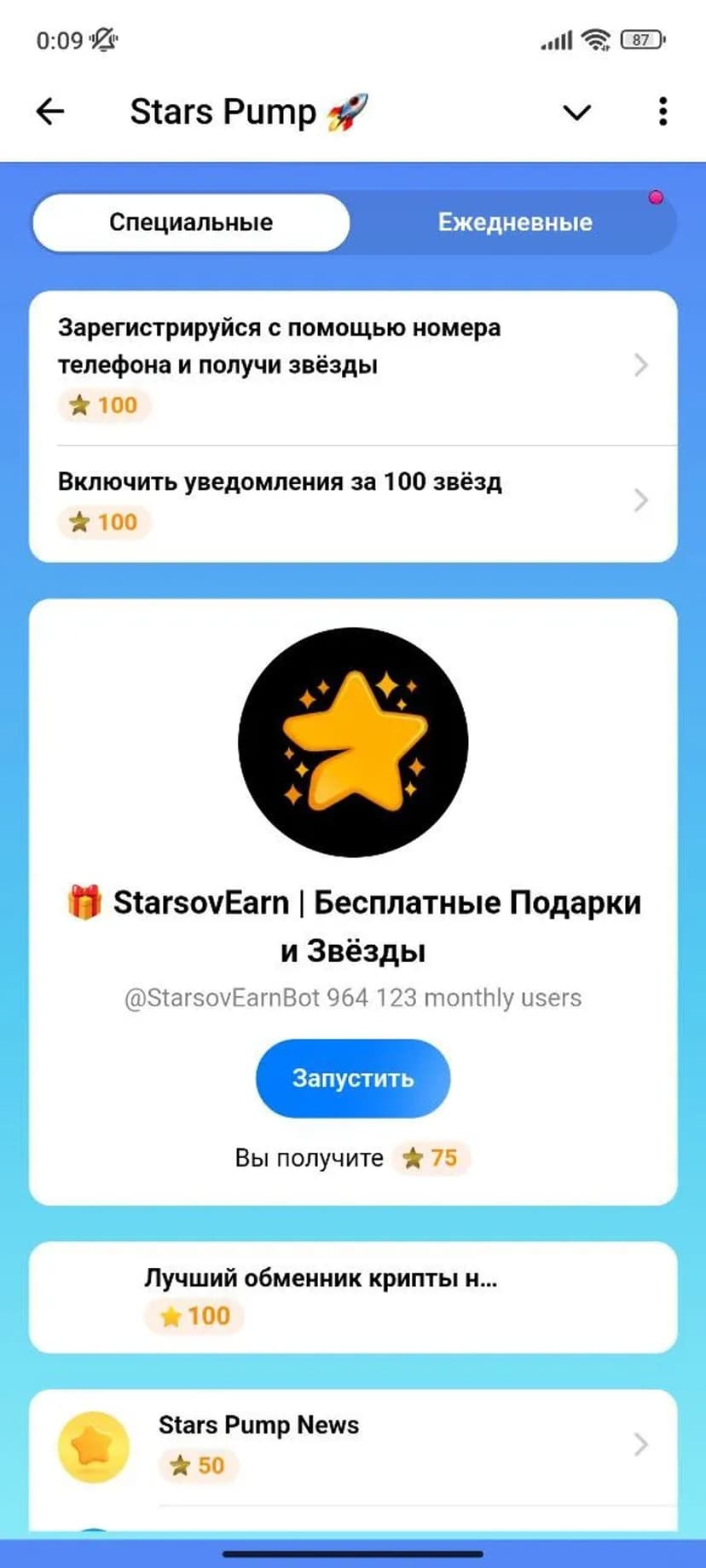 - Ежедневные задания: до 15 задач в день (подписки, репосты и т.п.), средняя награда ≈ 5 Stars, максимум — 10 Stars за задание.
