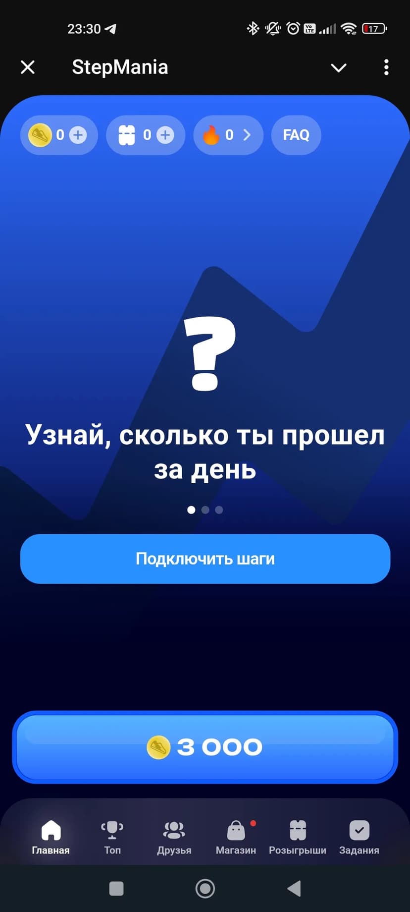 - Начисление монет — каждый шаг переводится в монеты (курс может меняться, например: 1000 шагов = 10 монет).