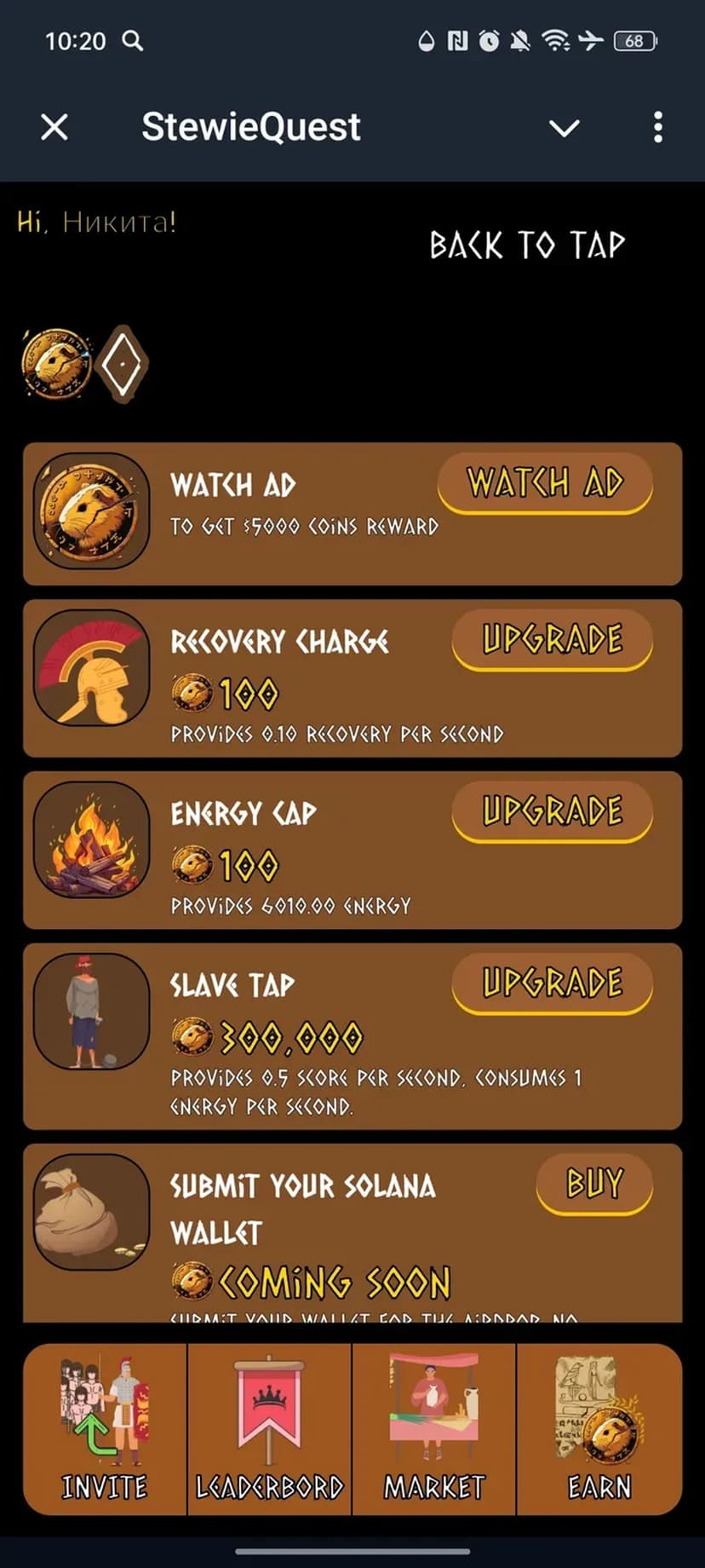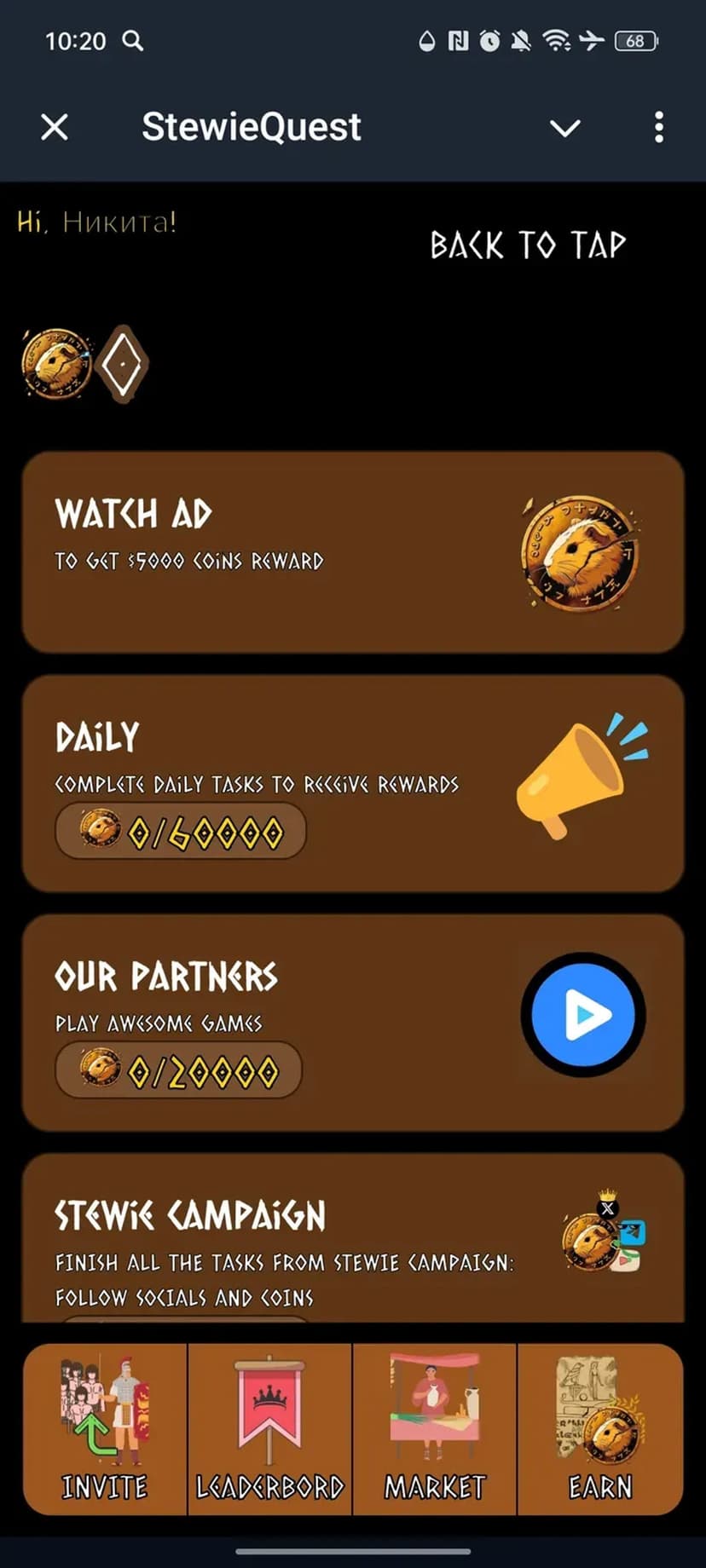 StewieQuest — кликер-игра с элементами автоматизации и накопления внутриигровых бонусов. Нажимая, вы получаете Coins и тратите их на улучшения для ускорения прогресса.