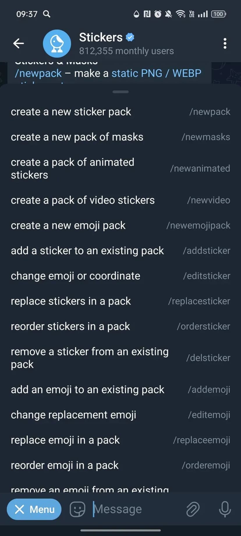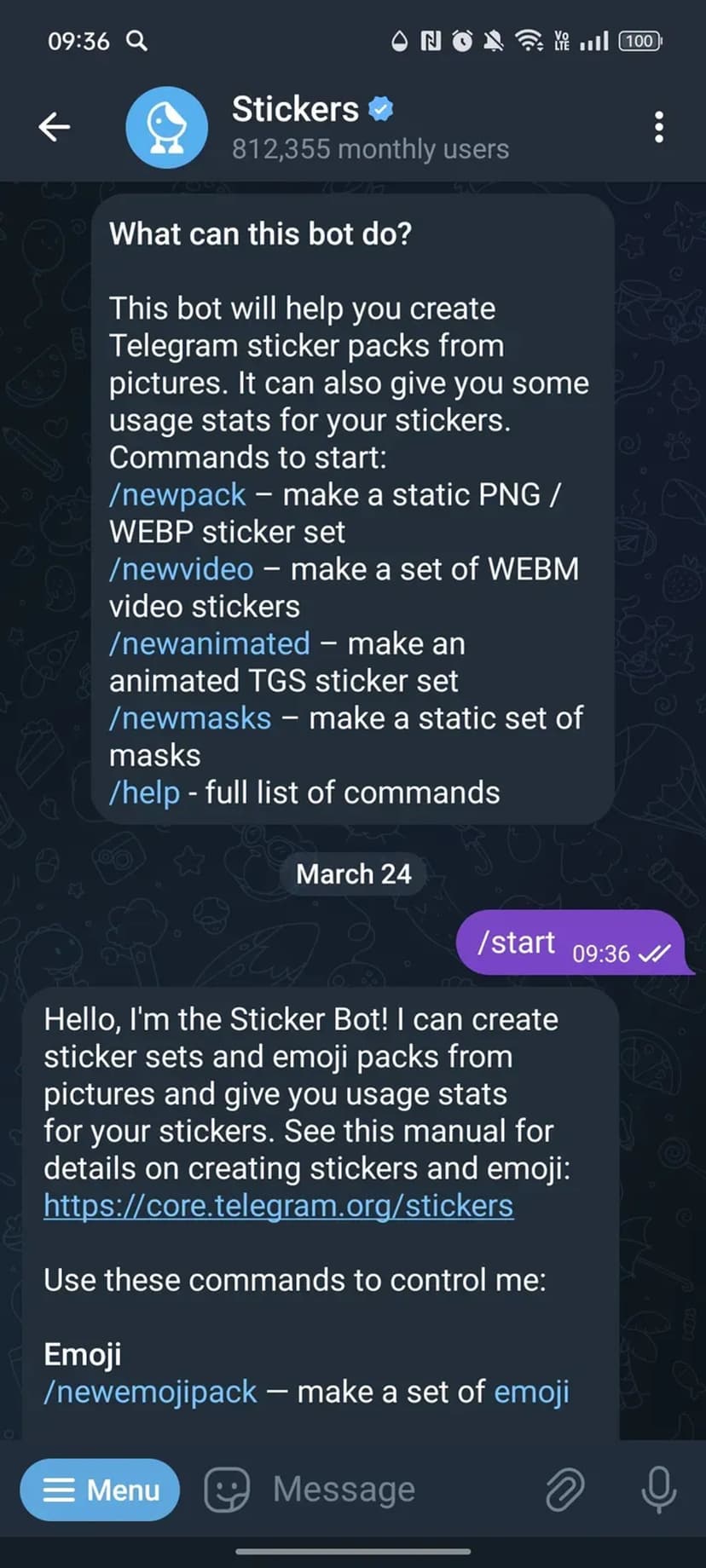 Stickers Bot помогает создавать стикерпаки и наборы эмодзи на основе ваших изображений. При первом запуске бот приветливо предлагает основные команды для создания новых наборов и просмотра статистики использования.