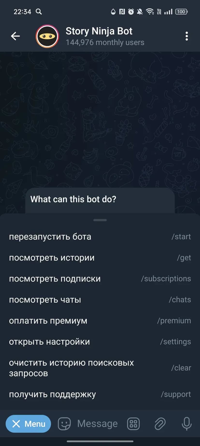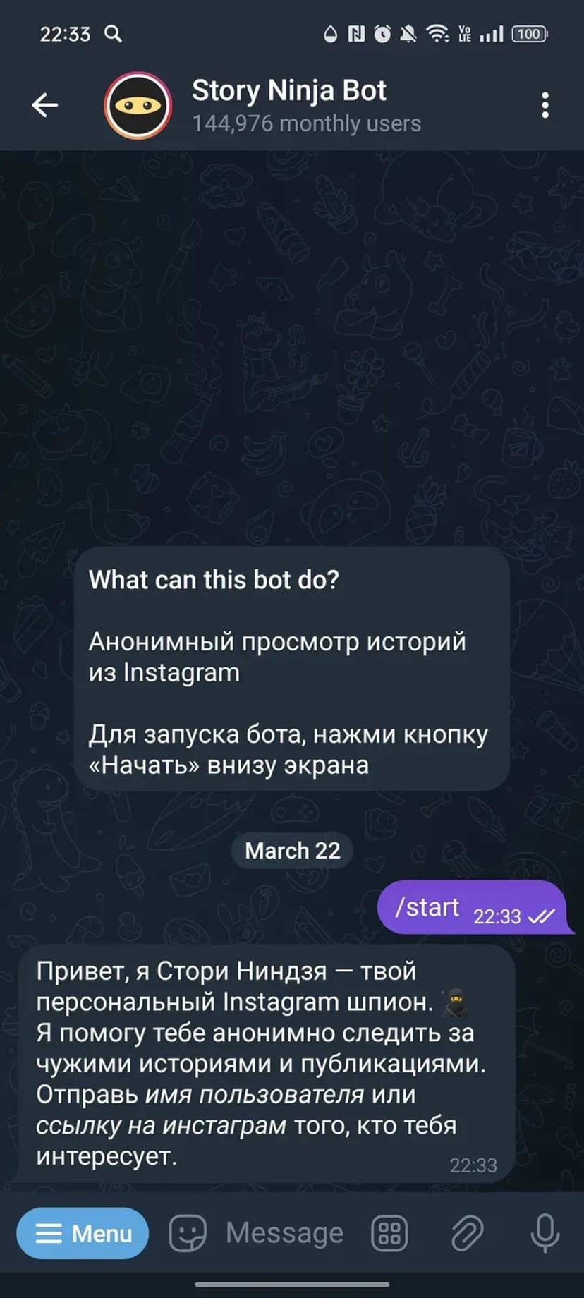 Story Ninja Bot обеспечивает анонимный доступ к текущим сторис и публикациям Instagram внутри Telegram‑чата. Интерфейс не требует регистрации или установки сторонних приложений: достаточно отправить никнейм или ссылку на профиль.