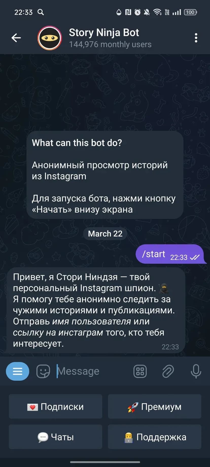 *Нажимая "Открыть в Telegram", вы перейдете к приложению Story Ninja Bot в мессенджере Telegram