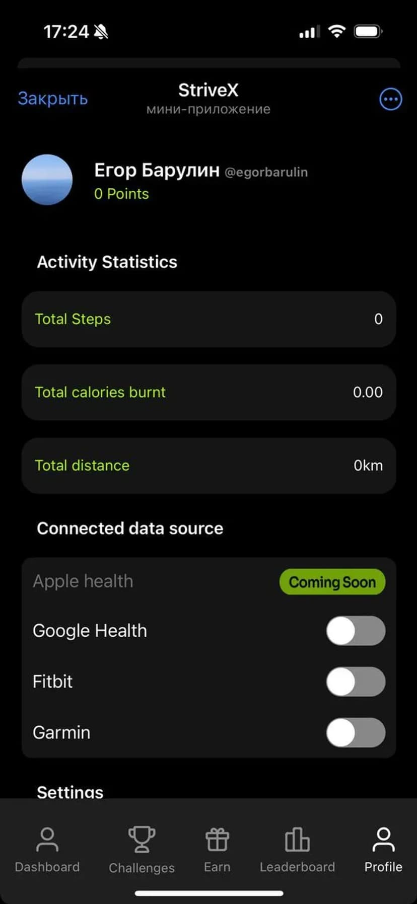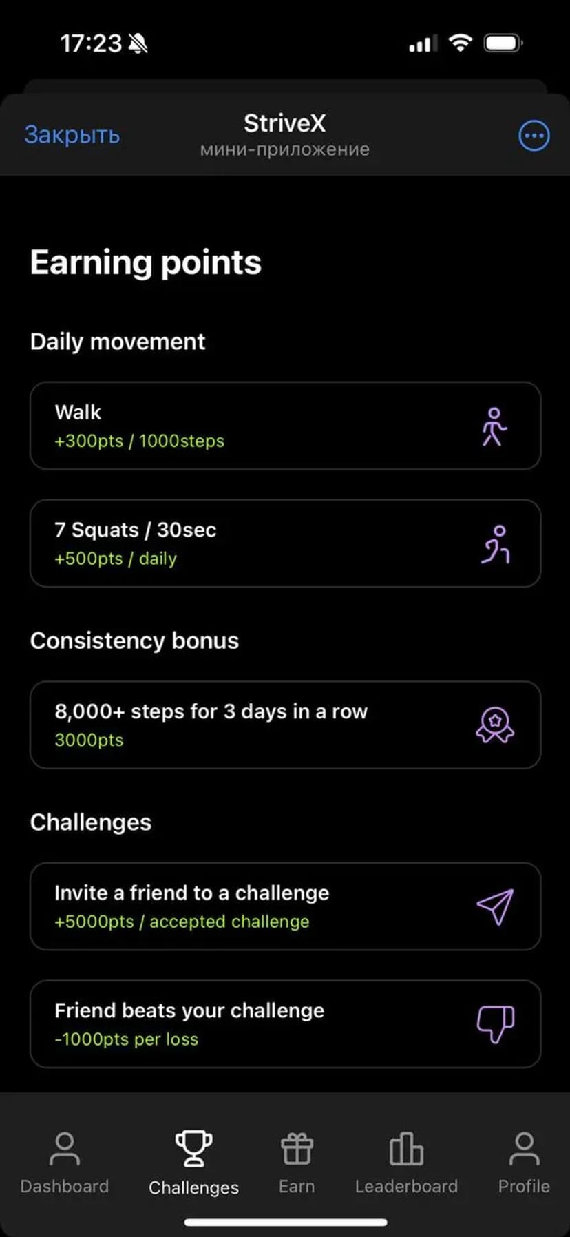 - Практическое использование: после подключения трекера активность автоматически учитывается в StriveX: выполнение ежедневных целей приносит очки, открытия достижений и NFT‑награды; результаты и статистика доступны в Telegram‑боте и личном кабинете, а все итоги фиксируются на блокчейне для прозрачности.