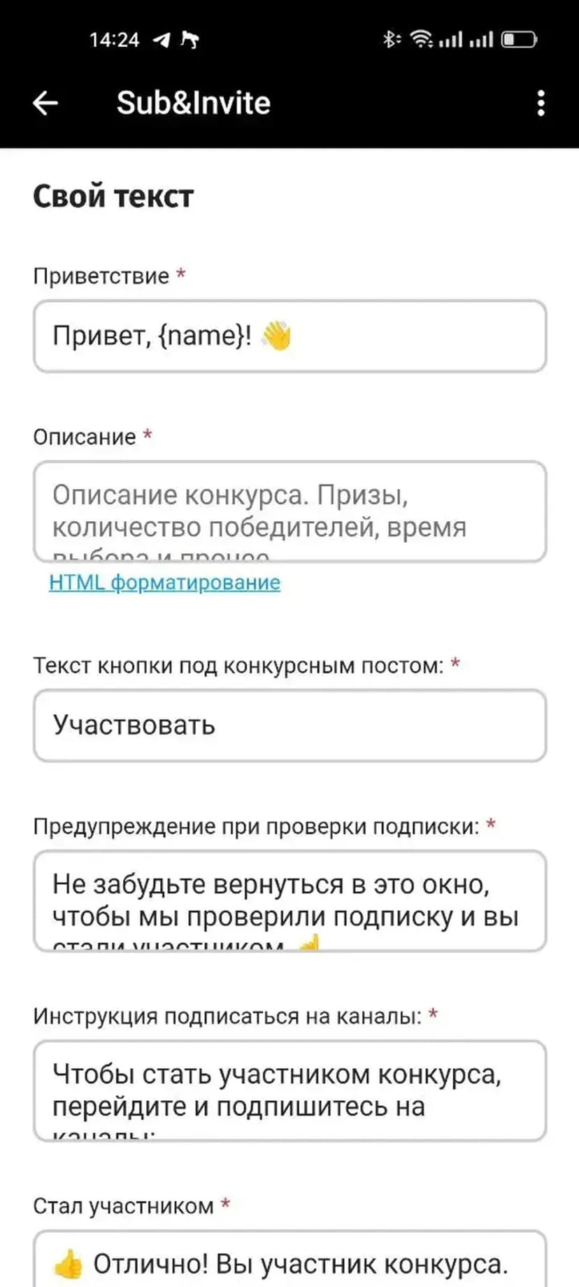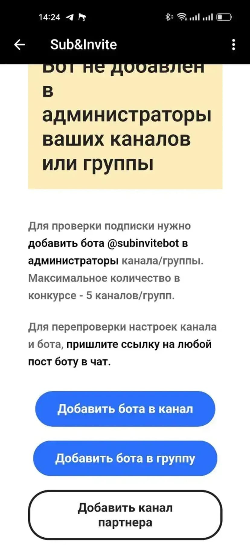 - Поддержка нескольких языков (русский, английский) и адрес для обратной связи: subinvitebot@gmail.com.