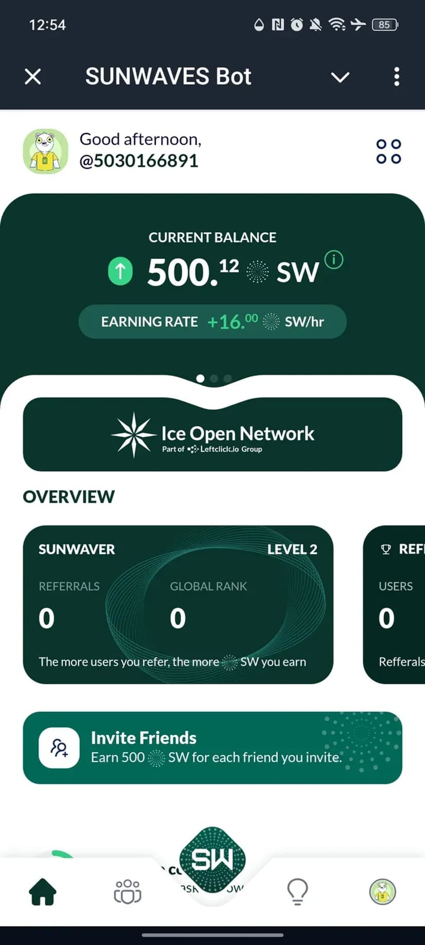 Механика проста: пользователь нажимает специальную кнопку раз в 24 часа, чтобы получить начисления SW. Дополнительно можно увеличивать доход с помощью заданий и реферальной программы — за каждого приглашённого оба участника получают по 500 SW.