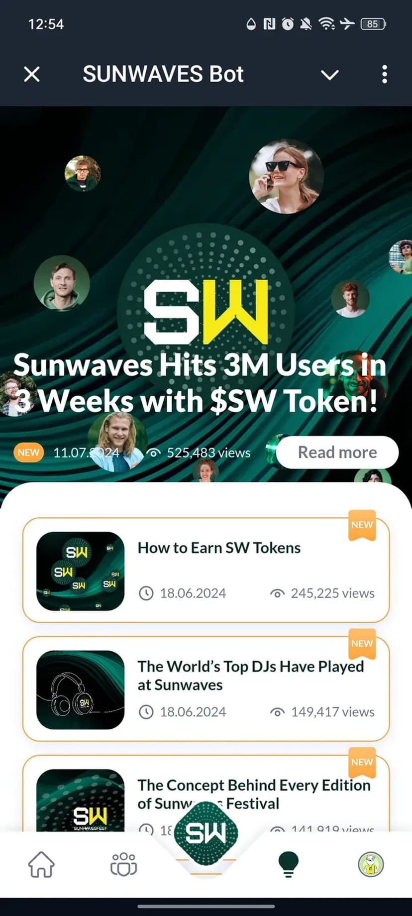 SUNWAVES Bot — бот для сообщества Sunwaves, которым ежемесячно пользуются более 17 700 человек. Проект ориентирован на любителей фестиваля и тех, кто интересуется блокчейн‑технологиями и цифровыми активами. Бот даёт возможность получать внутренний токен SW, используемый внутри экосистемы Sunwaves.