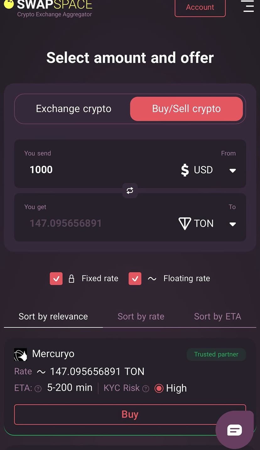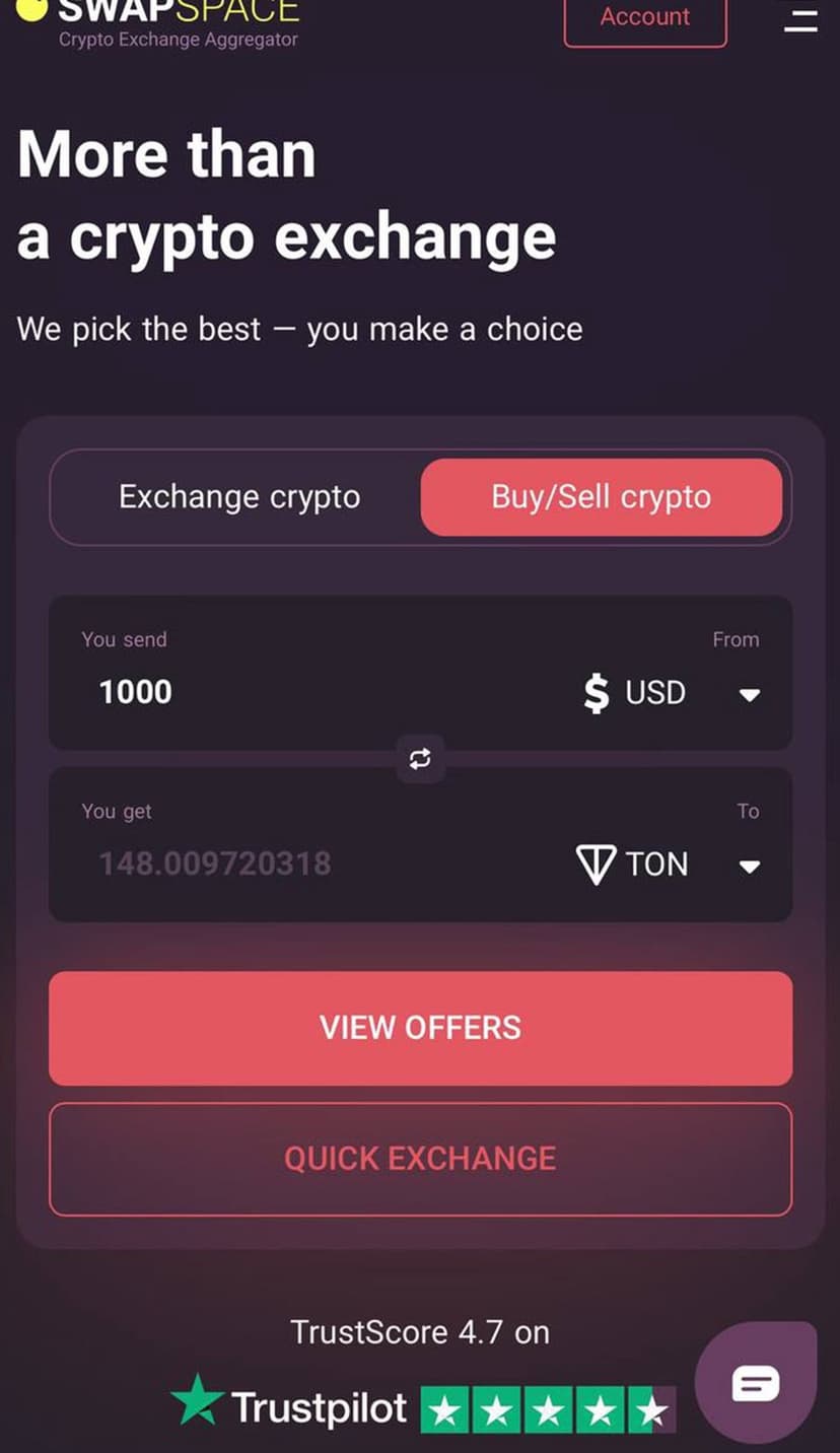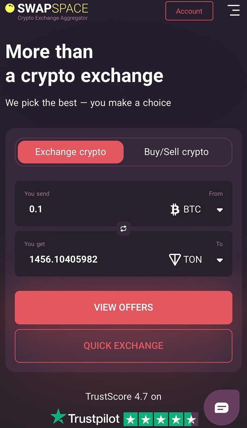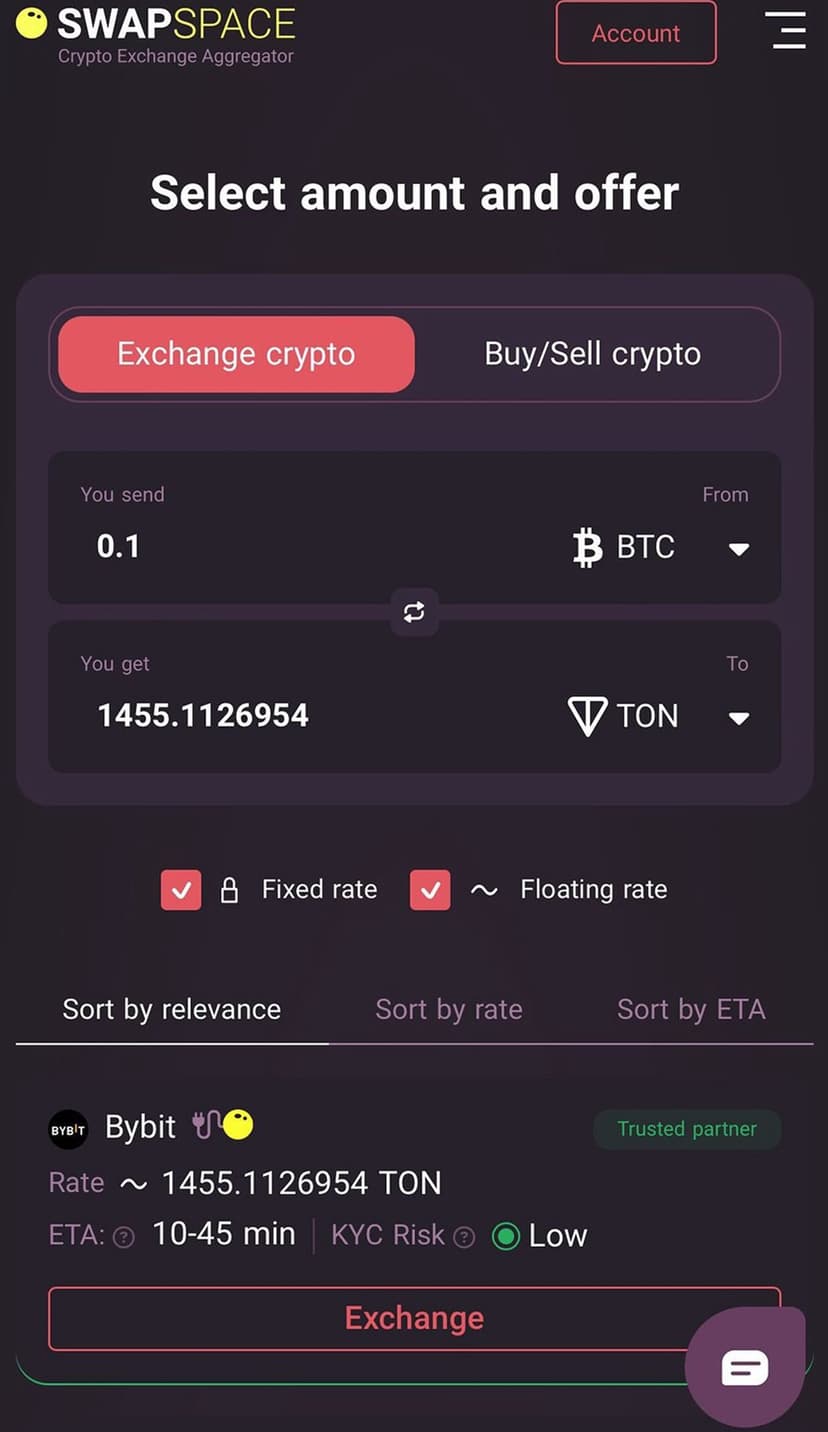 SwapSpace — агрегатор моментальных обменов криптовалют внутри Telegram. Подбирает предложения от десятков бирж и поддерживает более 3 800 криптовалют, при этом для обмена не требуется регистрация или создание аккаунта.